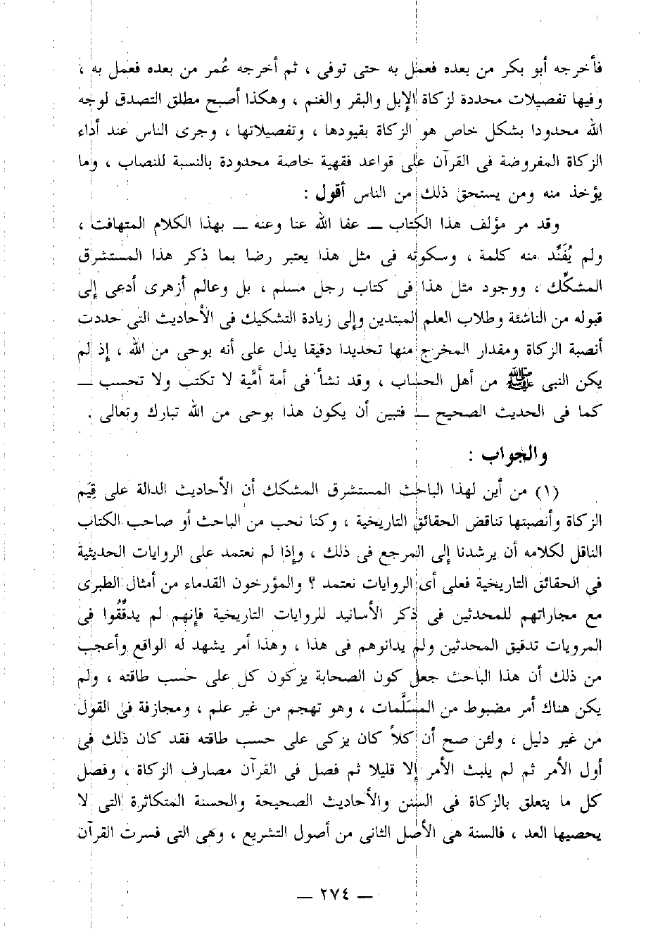 فأخرجه أبو بكر من بعده فعمل به حتى توفي، ثم أخرجه عمر من بعده فعمل به، وفيها تفصيلات محددة لزكاة الإبل والبقر والغنم، وهكذا أصبح مطلق التصدق لوجه الله محدودًا بشكل خاص هو الزكاة بقيودها، وتفصيلاتها، وجرى الناس عند أداء الزكاة المفروضة في القرآن على قواعد فقهية خاصة محدودة بالنسبة للنصاب، وما يؤخذ منه ومن يستحق ذلك من الناس أقول: وقد مر مؤلف هذا الكتاب - عَفَا اللهُ عَنَّا وَعَنْهُ - بهذا الكلام المتهافت، ولم يفند منه كلمة، وسكوته في مثل هذا يعتبر رضا بما ذكر هذا المستشرق المشكك، ووجود مثل هذا في كتاب رجل مسلم، بل وعالم أزهري أدعى إلى قبوله من الناشئة وطلاب العلم المبتدئين وإلى زيادة التشكيك في الأحاديث التي حددت أنصبة الزكاة ومقدار المخرج منها تحديدًا دقيقًا يدل على أنه بوحي من الله، إذ لم يكن النبي - صَلََّى اللهُ عَلَيْهِ وَسَلَّمَ - من أهل الحساب، وقد نشأ في أمة أمية لا تكتب ولا تحسب - كما في الحديث الصحيح - فتبين أن يكون هذا بوحي من الله - تَبَارَكَ وَتَعَالَى -.