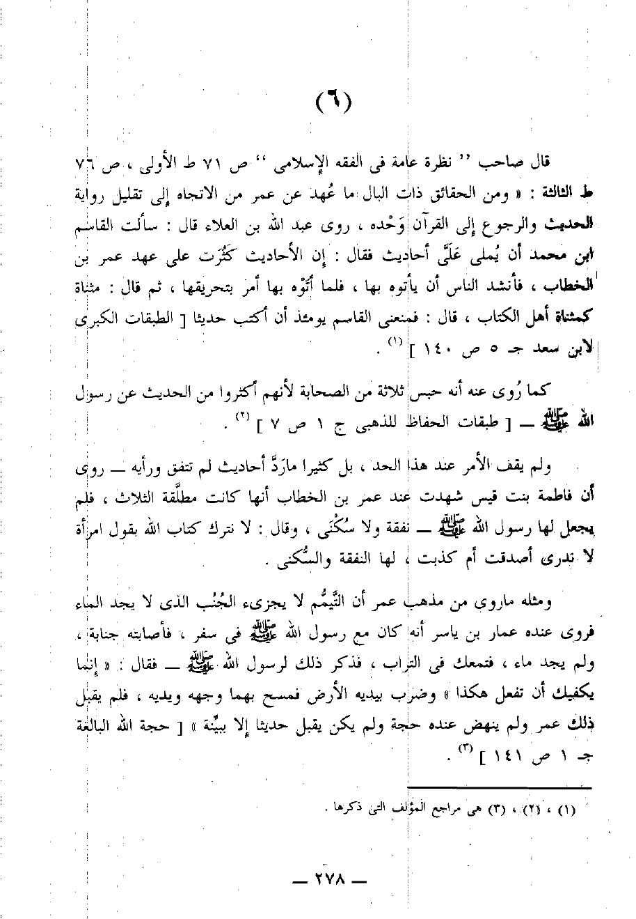 قال صاحب " نظرة عامة في الفقه الإسلامي ": ص 71 ط الأولى، ص 76 ط الثالثة: «ومن الحقائق ذات البال ما عهد عن عمر من الاتجاه إلى تقليل رواية الحديث والرجوع إلى القرآن وحده، روى عبد الله بن العلاء قال: سألت القاسم بن محمد أن يملي عليَّ أحاديث فقال: إن الأحاديث كثرت على عهد عمر بن الخطاب، فأنشد الناس أن يأتوه بها، فلما أتوه بها أمر بتحريقها، ثم قال: مثناة كمثناة أهل الكتاب، قال: فمنعني القاسم يومئذ أن أكتب حديثا (الطبقات الكبرى لابن سعد) ج 5 ص 140» (¬1).