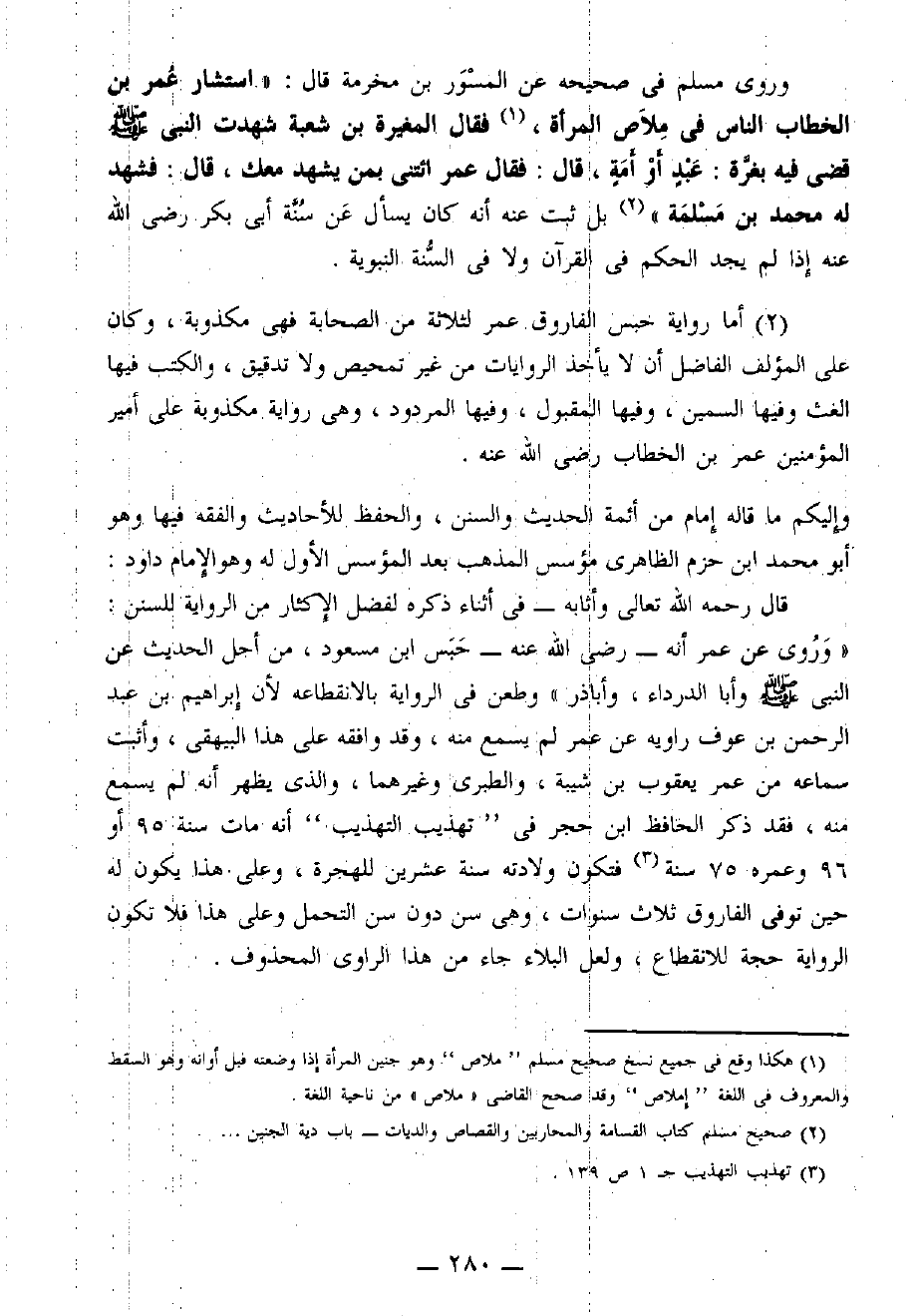 وإليكم ما قاله إمام من أئمة الحديث والسنن، والحفظ للأحاديث والفقه فيها وهو أبو محمد بن حزم الظاهري مؤسس المذهب بعد المؤسس الأول له وهو الإمام داود: قال - رَحِمَهُ اللهُ تَعَالَى وَأَثَابَهُ - في أثناء ذكره لفضل الإكثار من الرواية للسنن: «وروي عن عمر أنه - رَضِيَ اللهُ عَنْهُ - حبس ابن مسعود، من أجل الحديث عن النبي - صَلََّى اللهُ عَلَيْهِ وَسَلَّمَ - وأبا الدرداء، وأبا ذر» وطعن في الرواية [بالانقطاع] لأن إبراهيم بن عبد الرحمن بن عوف راويه عن عمر لم يسمع منه، وقد وافقه على هذا البيهقي، وأثبت سماعه من عمر يعقوب بن شيبة، والطبري وغيرهما، والذي يظهر أنه لم يسمع منه، فقد ذكر الحافظ ابن حجر في " تهذيب التهذيب " أنه مات سنة 95 أو 96 وعمره 75 سَنَةً (¬3) فتكون ولادته سنة عشرين للهجرة، وعلى هذا يكون له حين توفي الفاروق ثلاث سنوات، وهي سن دون سن التحمل وعلى هذا فلا تكون الرواية حُجَّةً للانقطاع، ولعل البلاء جاء من هذا الراوي المحذوف.