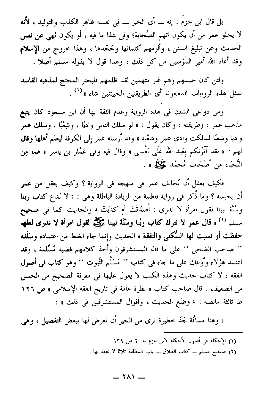 فكيف يعقل أن يخالف عمر في منهجه في الرواية؟ وكيف يعقل من عمر أن يحبسه؟ وما ذكر في رواية فاطمة من الزيادة الباطلة وهي: «لاَ نَدَعُ كِتَابَ رَبِّنَا وَسُنَّةَ نَبِيِّنَا صَلَّى اللهُ عَلَيْهِ وَسَلَّمَ لِقَوْلِ امْرَأَةٍ لاَ نَدْرْي أَصَدَقَتْ أَمْ كَذَبَتْ» (*) والحديث كما في " صحيح مسلم " (¬2) قال عمر: «لاَ نَتْرُكُ كِتَابَ [اللهِ] وَسُنَّةَ نَبِيِّنَا صَلَّى اللهُ عَلَيْهِ وَسَلَّمَ لِقَوْلِ امْرَأَةٍ، لاَ نَدْرِي لَعَلَّهَا حَفِظَتْ، أَوْ نَسِيَتْ، لَهَا السُّكْنَى وَالنَّفَقَةُ». الحديث وإنما جاء الغلط من اعتماده وسلفه صاحب " الضحى " على ما قاله المستشرقون وأخذ كلامهم قضية مُسَلَّمَةً، وقد اعتمد هؤلاء وأولئك على ما جاء في كتاب " مسلم الثبوت " وهو كتاب في أصول الفقه، لا كتاب حديث وهذه الكتب لا يعول عليها في معرفة الصحيح من الحسن من الضعيف، قال صاحب كتاب " نظرة عامة في تاريخ الفقه الإسلامي ": ص 126 ط ثالثة ما نصه: «وضع الحديث، وأقوال المستشرقين في ذلك»: