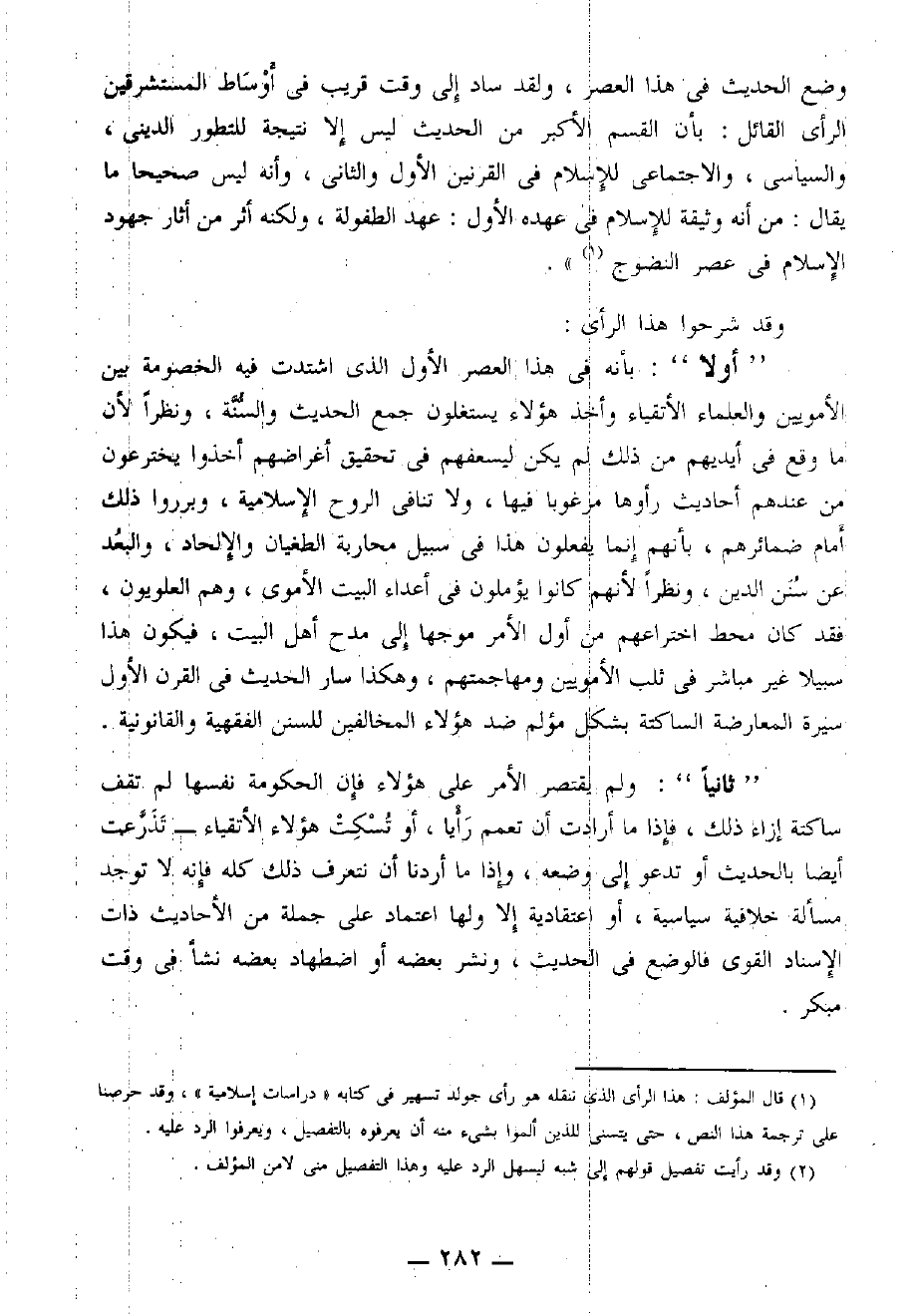 (¬1) قال المؤلف: هذا الرأي الذي ننقله هو رأي جولدتسيهر في كتابه " دراسات إسلامية "، وقد حرصنا على ترجمة هذا النص، حتى يتسنى للذين أَلَمُّوا بشيء منه أن يعرفوه بالتفصيل، ويعرفوا الرد عليه.