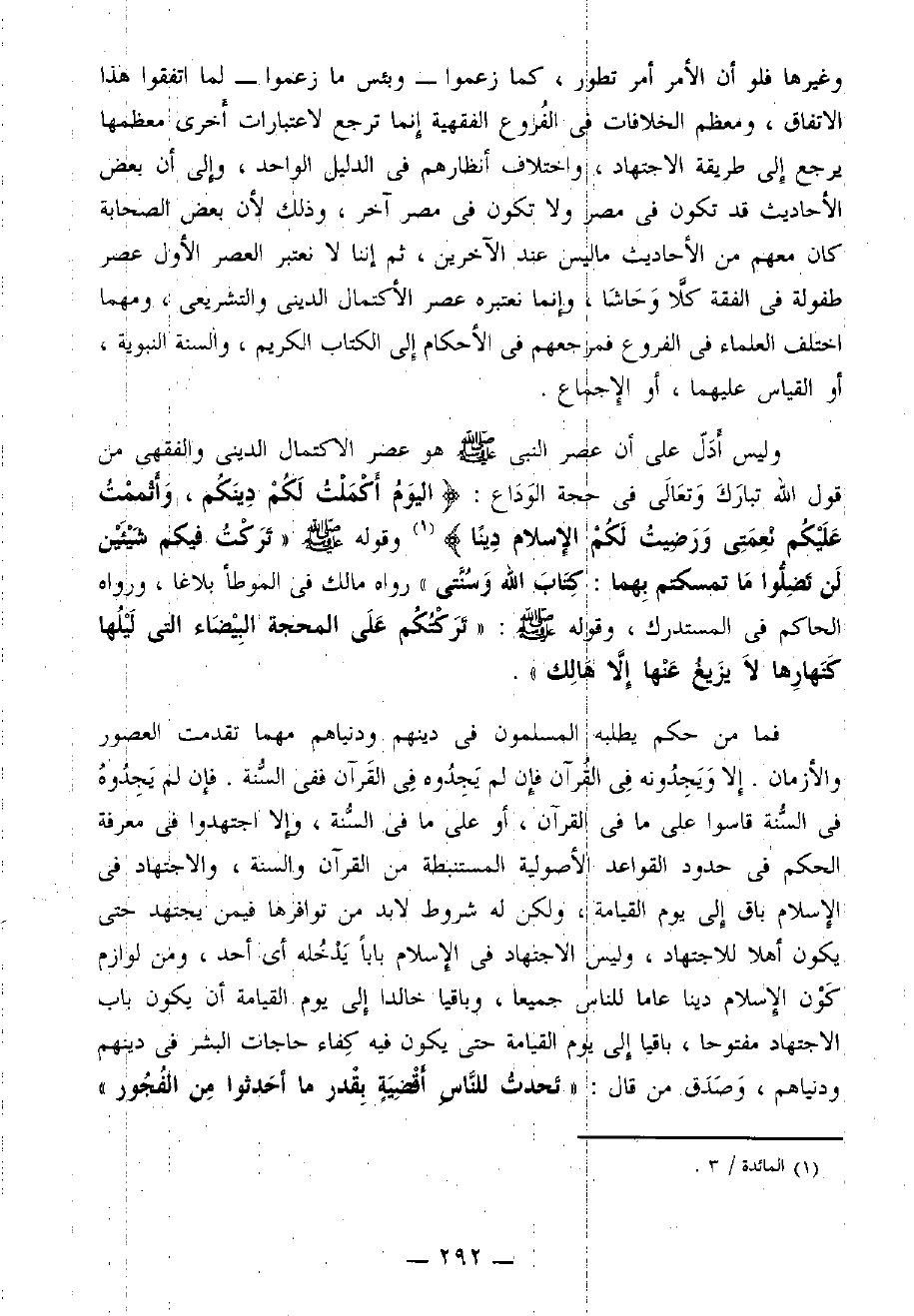 وليس أدل على أن عصر النبي - صَلََّى اللهُ عَلَيْهِ وَسَلَّمَ - هو عصر الاكتمال الديني والفقهي من قول الله - تَبَارَكَ وَتَعَالَى - في حَجَّةِ الوَدَاعِ: {الْيَوْمَ أَكْمَلْتُ لَكُمْ دِينَكُمْ وَأَتْمَمْتُ عَلَيْكُمْ نِعْمَتِي وَرَضِيتُ لَكُمُ الإِسْلاَمَ دِينًا} (¬1) وقوله - صَلََّى اللهُ عَلَيْهِ وَسَلَّمَ -: «تَرَكْتُ فِيكُمْ [أَمْرَيْنِ] لَنْ تَضِلُّوا مَا تَمَسَّكْتُمْ بِهِمَا: كِتَابَ اللهِ وَسُنَّةَ نَبِيِّهِ» رواه مالك في " الموطأ " بلاغًا، ورواه الحاكم في " المستدرك "، وقوله - صَلََّى اللهُ عَلَيْهِ وَسَلَّمَ -: «قَدْ تَرَكْتُكُمْ عَلَى الْبَيْضَاءِ لَيْلُهَا كَنَهَارِهَا لاَ يَزِيغُ عَنْهَا بَعْدِي إِلاَّ هَالِكٌ» (*).