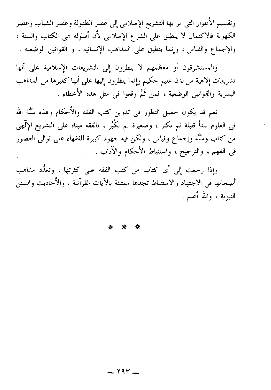 وتقسيم الأطوار التي مر بها التشريع الإسلامي إلى عصر الطفولة وعصر الشباب وعصر الكهولة فالاكتمال لا ينطبق على الشرع الإسلامي لأن أصوله هي الكتاب والسنة، والإجماع والقياس، وإنما ينطبق على المذاهب الإنسانية، والقوانين الوضعية.