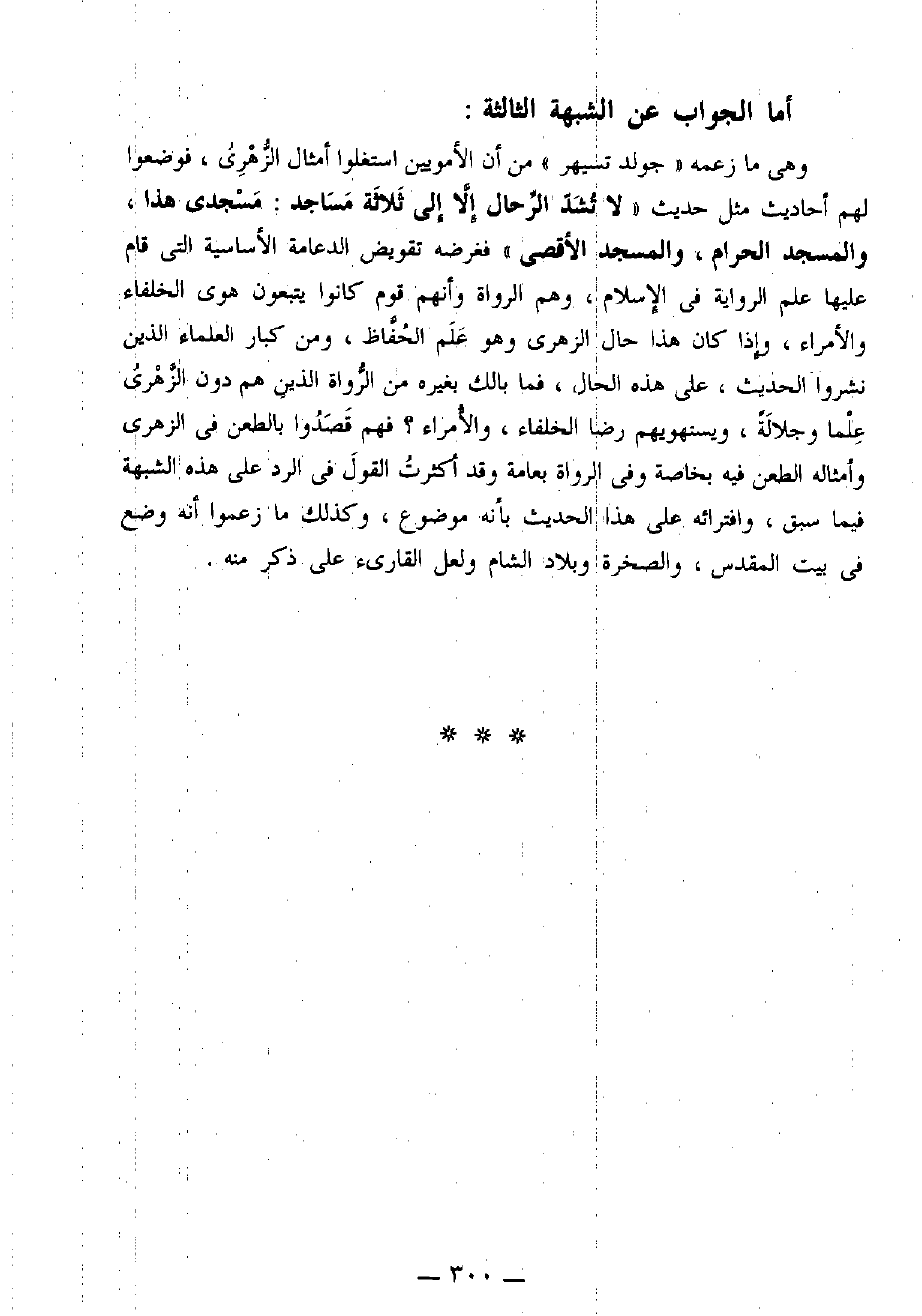 وهي ما زعمه " جولدتسيهر " من أن الأمويين استغلوا أمثال الزهري، فوضعوا لهم أحاديث مثل حديث «لاَ تُشَدُّ الرِّحَالُ إِلاَّ إِلَى ثَلاَثَةِ مَسَاجِدَ: مَسْجِدِي هَذَا، وَالْمَسْجِدِ الْحَرَامِ، وَالمَسْجِدِ الأَقْصَى» فغرضه تقويض الدعامة الأساسية التي قام عليها علم الرواية في الإسلام، وهم الرواة وأنهم قوم كانوا يتبعون هوى الخلفاء والأمراء، وإذا كان هذا حال الزهري وهو علم الحفاظ، ومن كبار العلماء الذين نشروا الحديث، على هذه الحال، فما بالك بغيره من الرواة الذين هم دون الزهري عِلْمًا وَجَلاَلَةً، ويستهويهم رضا الخلفاء، والأمراء؟ فهم قصدوا بالطعن في الزهري وأمثاله الطعن فيه بخاصة وفي الرواة بعامة وقد أكثرت القول في الرد على هذه الشبهة فيما سبق، وافترائه على هذا الحديث بأنه موضوع، وكذلك ما زعموا أنه وضع في بيت المقدس، والصخرة وبلاد الشام ولعل القارئ على ذكر منه.