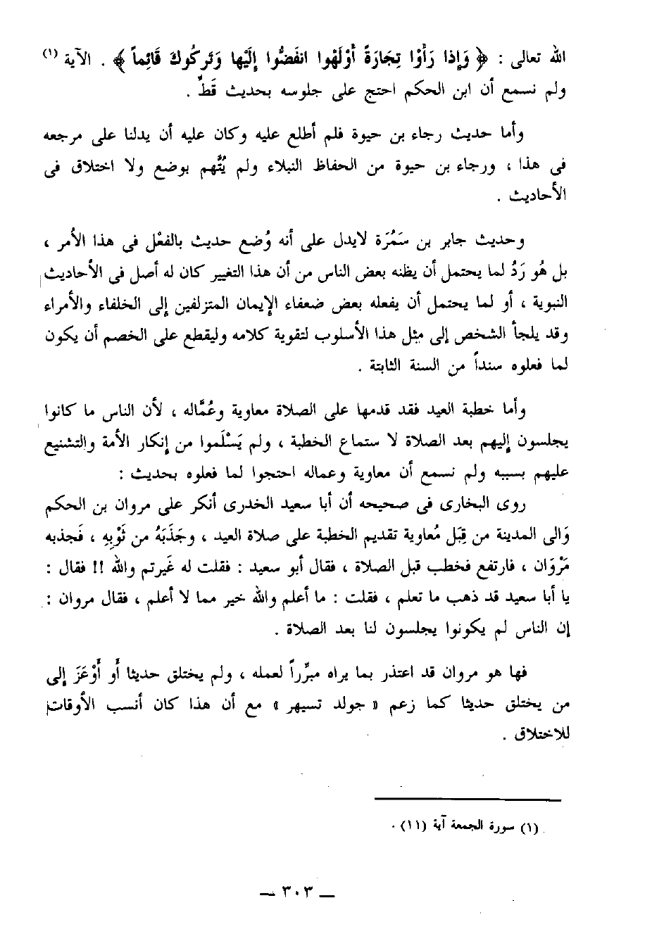 اللهُ تَعَالَى: {وَإِذَا رَأَوْا تِجَارَةً أَوْ لَهْوًا انْفَضُّوا إِلَيْهَا وَتَرَكُوكَ قَائِمًا}» الآية (¬1). ولم نسمع أن ابن الحكم احتج على جلوسه بحديث قط.