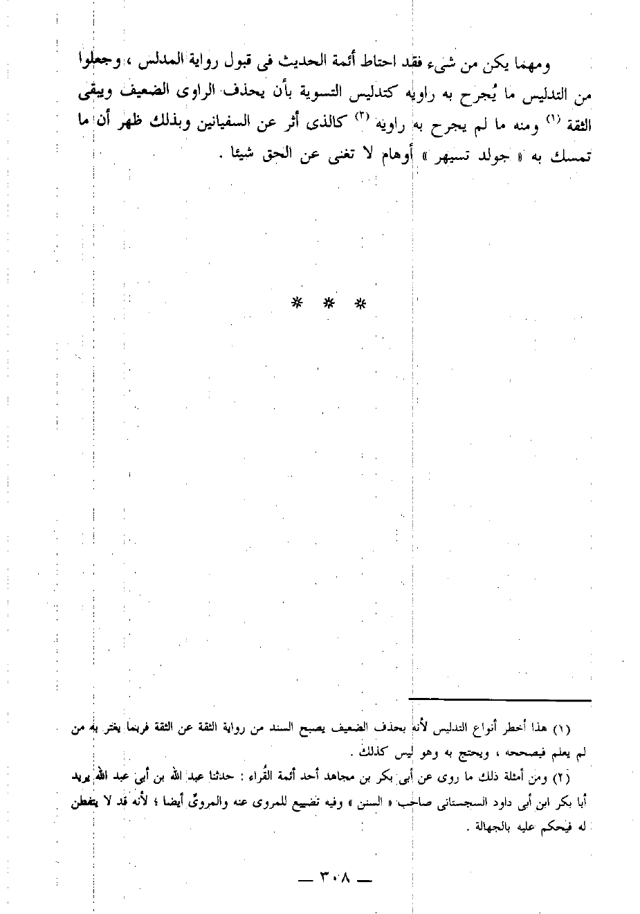 ومهما يكن من شيء فقد احتاط أئمة الحديث في قبول رواية المدلس، وجعلوا من التدليس ما يجرح به راويه كتدليس التسوية بأن يحذف الراوي الضعيف ويبقى الثقة (¬1) ومنه ما لم يجرح به راويه (¬2) كالذي أثر عن السفيانين وبذلك ظهر أن ما تمسك به " جولدتسيهر " أوهام لا تغني عن الحق شيئًا.