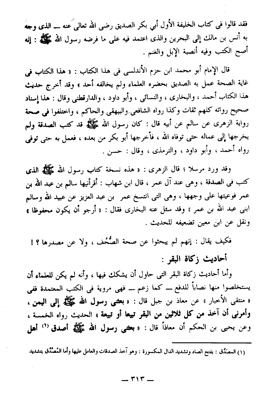 وأما أحاديث زكاة البقر التي حاول أن يشكك فيها، وأنه لم يكن للعلماء أن يستخلصوا منها نِصَابًا للدفع - كما زعم - فهي مروية في الكتب المعتمدة ففي " منتقى الأخبار " عَنْ مُعَاذِ بْنِ جَبَلٍ قَالَ: «بَعَثَنِي رَسُولُ اللهِ صَلَّى اللهُ عَلَيْهِ وَسَلَّمَ إِلَى الْيَمَنِ، وَأَمَرَنِي أَنْ آخُذَ مِنْ كُلِّ ثَلاَثِينَ مِنَ الْبَقَرِ تَبِيعًا أَوْ تَبِيعَةُ». الحديث رواه الخمسة، وَعَنْ يَحْيَى بْنِ الْحَكَمِ، أَنَّ مُعَاذًا قَالَ: «بَعَثَنِي رَسُولُ اللهِ صَلَّى اللهُ عَلَيْهِ وَسَلَّمَ أُصَدِّقُ (¬1) أَهْلَ