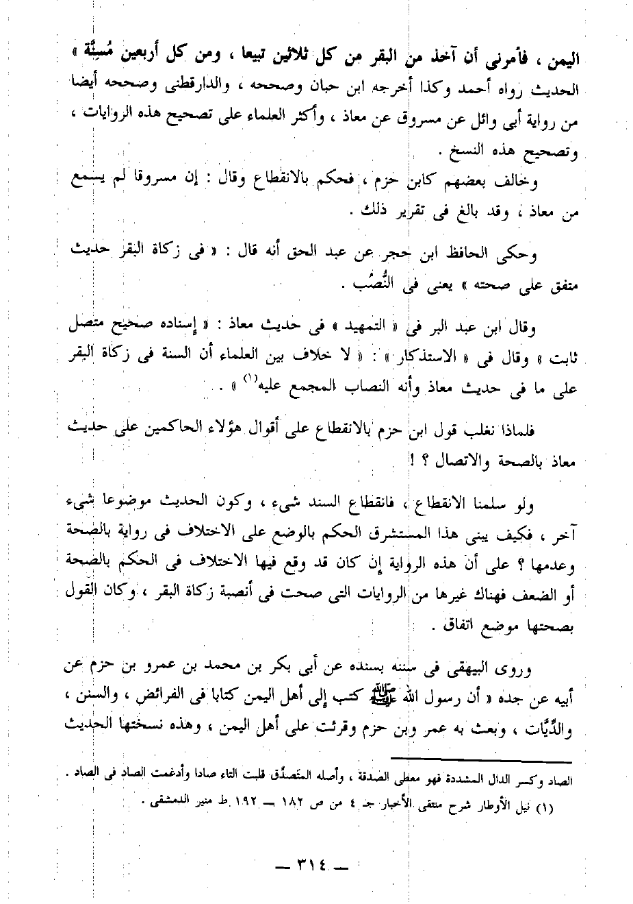 اليَمَنِ فَأَمَرَنِي أَنْ آخُذَ مِنَ الْبَقَرِ مِنْ كُلِّ ثَلاَثِينَ تَبِيعًا، وَمِنْ كُلِّ أَرْبَعِينَ مُسِنَّةً». الحديث رواه أحمد وكذا أخرجه ابن حبان وصححه، والدارقطني وصححه اَيْضًا من رواية أبي وائل عن مسروق عن معاذ، وأكثر العلماء على تصحيح هذه الروايات، وتصحيح هذه النسخ.