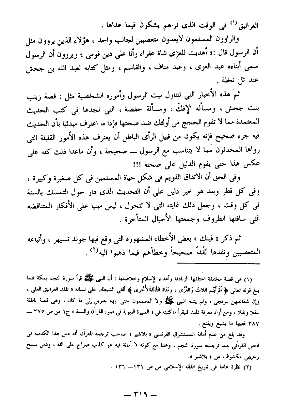 ثم هذه الأخبار التي تتناول بيت الرسول وأموره الشخصية مثل: قصة زينب بنت جحش، ومسألة الإفك، ومسألة حفصة، التي نجدها في كتب الحديث المعتمدة مما لا تقوم الحجج من أولئك ضد صحتها فإذا ما اعترف مَبْدَئِيًّا بأن الحديث فيه جزء صحيح فإنه يكون من قبيل الرأي الباطل أن يعترف هذه الأمور القليلة التي رواها المحدثون مما لا يتناسب مع الرسول - صحيحة، وأن ما عدا ذلك كله على عكس هذا حتى يقوم الدليل على صحته!!!