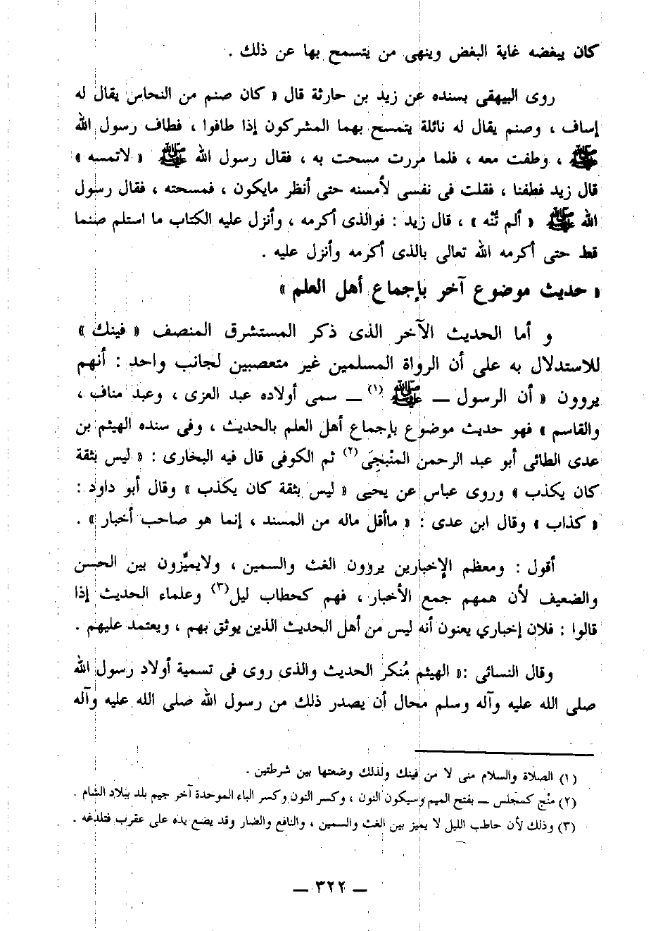 وأما الحديث الآخر الذي ذكر المستشرق المنصف " فينك " للاستدلال به على أن الرواة المسلمين غير متعصبين لجانب واحد: أنهم يَرْوُونَ «أَنَّ الرَّسُولَ - صَلََّى اللهُ عَلَيْهِ وَسَلَّمَ - (¬1) سَمَّى أَوْلاَدَهُ عَبْدَ العُزَّى، وَعَبْدَ مَنَافٍ، وَالقَاسِمَ» فهو حديث موضوع بإجماع أهل العلم بالحديث، وفي سنده الهيثم بن عدي الطائي أبو عبد الرحمن المَنْبِجِيِّ (¬2) ثم الكوفي قال فيه البخاري: «لَيْسَ بِثِقَةٍ كَانَ يَكْذِبُ» وروى عباس عن يحيى «لَيْسَ بِثِقَةٍ كَانَ يَكْذِبُ» وقال أبو داود: «كَذَّابٌ» وقال ابن عدي: «مَا أَقَلَّ مَا لَهُ مِنَ المُسْنَدِ، إِنَّمَا هُوَ صَاحِبُ أَخْبَارٍ».