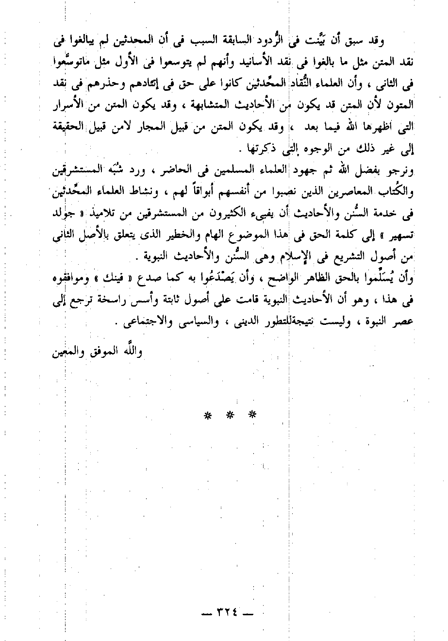 وأن يسلموا بالحق الظاهر الواضح، وأن يصدعوا به كما صدع " فينك " وموافقوه في هذا، وهو أن الأحاديث النبوية قامت على أصول ثابتة وأسس راسخة ترجع إلى عصر النبوة، وليست نتيجة للتطور الديني، والسياسي والاجتماعي.