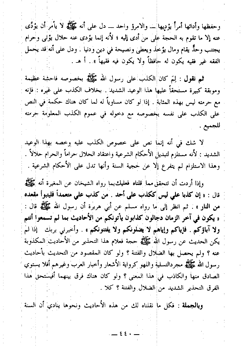 وإذا أردت أن تتحقق مما قلناه فعليك بما رواه الشيخان عن المغيرة أنه - صَلََّى اللهُ عَلَيْهِ وَسَلَّمَ - قال: «إِنَّ كَذِبًا عَلَيَّ لَيْسَ كَكَذِبٍ عَلَى أَحَدٍ، مَنْ كَذَبَ عَلَيَّ مُتَعَمِّدًا فَلْيَتَبَوَّأْ مَقْعَدَهُ مِنَ النَّارِ». ثم انظر إلى ما رواه " مسلم " عن أبي هريرة أن رسول الله - صَلََّى اللهُ عَلَيْهِ وَسَلَّمَ - قال: «يَكُونُ فِي آخِرِ الزَّمَانِ دَجَّالُونَ كَذَّابُونَ، يَأْتُونَكُمْ مِنَ الأَحَادِيثِ بِمَا لَمْ تَسْمَعُوا أَنْتُمْ، وَلاَ آبَاؤُكُمْ، فَإِيَّاكُمْ وَإِيَّاهُمْ، لاَ يُضِلُّونَكُمْ، وَلاَ يَفْتِنُونَكُمْ». وأخبرني بربك إذا لم يكن الحديث عن رسول الله - صَلََّى اللهُ عَلَيْهِ وَسَلَّمَ - حجة فعلام هذا التحذير من الأحاديث المكذوبة عنه؟ ولم يحصل بها الضلال والفتنة؟ ولو كان المقصود من التحديث بأحاديث رسول الله - صَلََّى اللهُ عَلَيْهِ وَسَلَّمَ - مجرد التسلية واللهو كرواية الأشعار وأخبار العرب وغيرهم أفلا يستوي الصادق منها والكاذب في هذا المعنى؟ ولو كان هناك فرق بينهما أفيستحق هذا الفرق التحذير الشديد من الضلال والفتنة؟ كَلاَّ.