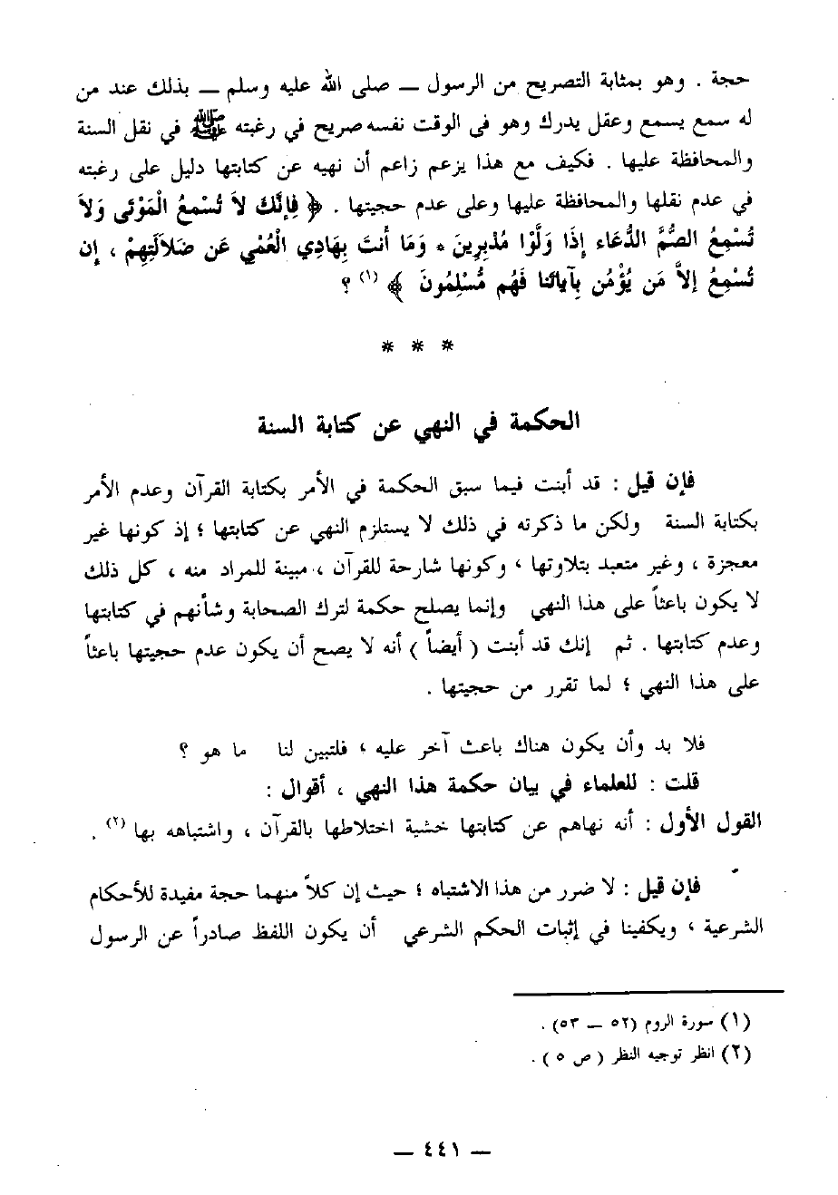 حجة. وهو بمثابة التصريح من الرسول - صَلََّى اللهُ عَلَيْهِ وَسَلَّمَ - بذلك عند من له سمع يسمع وعقل يدرك وهو في الوقت نفسه صريح في رغبته - صَلََّى اللهُ عَلَيْهِ وَسَلَّمَ - في نقل السُنَّةِ والمحافظة عليها. فكيف مع هذا يزعم زاعم أن نهيه عن كتابتها دليل على رغبته في عدم نقلها والمحافظة عليها وعلى عدم حجيتها {فَإِنَّكَ لاَ تُسْمِعُ الْمَوْتَى وَلاَ تُسْمِعُ الصُّمَّ الدُّعَاءَ إِذَا وَلَّوْا مُدْبِرِينَ، وَمَا أَنْتَ بِهَادِ (*) الْعُمْيِ عَنْ ضَلاَلَتِهِمْ إِنْ تُسْمِعُ إِلاَّ مَنْ يُؤْمِنُ بِآيَاتِنَا فَهُمْ مُسْلِمُونَ} (¬1)؟.