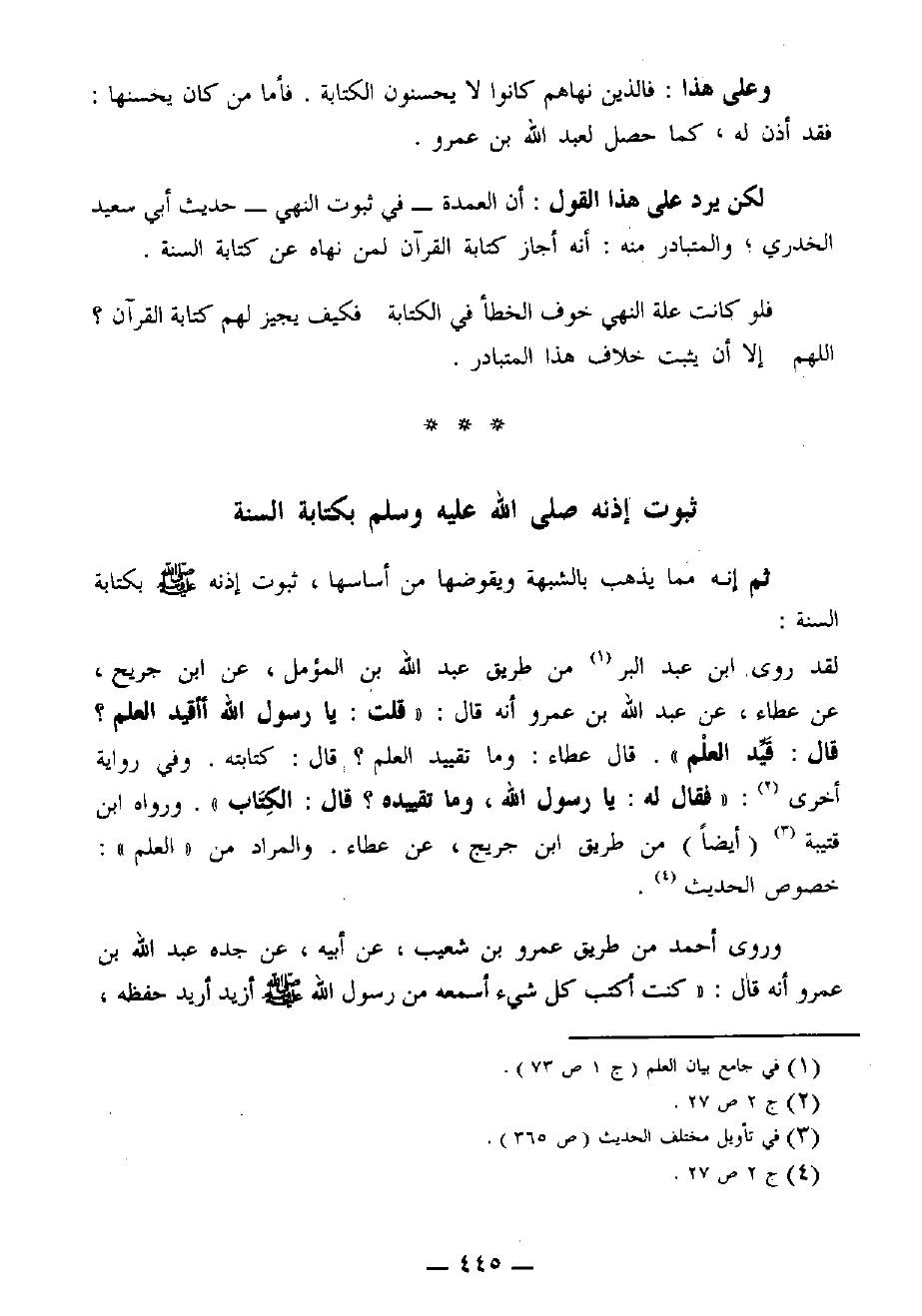 (*) في كلا الحديثين وردت كلمة (الكتاب) ولم ترد كلمة (كتابته)، انظر: " جامع بيان العلم وفضله " لابن عبد البر، تحقيق أبي الأشبال الزهيري، ص 317، حديث رقم 412 وكذلك ص 763، حديث رقم 1409، الطبعة الأولى: 1414 هـ - 1994 م، نشر دار ابن الجوزي للنشر والتوزيع. الرياض - المملكة العربية السعودية