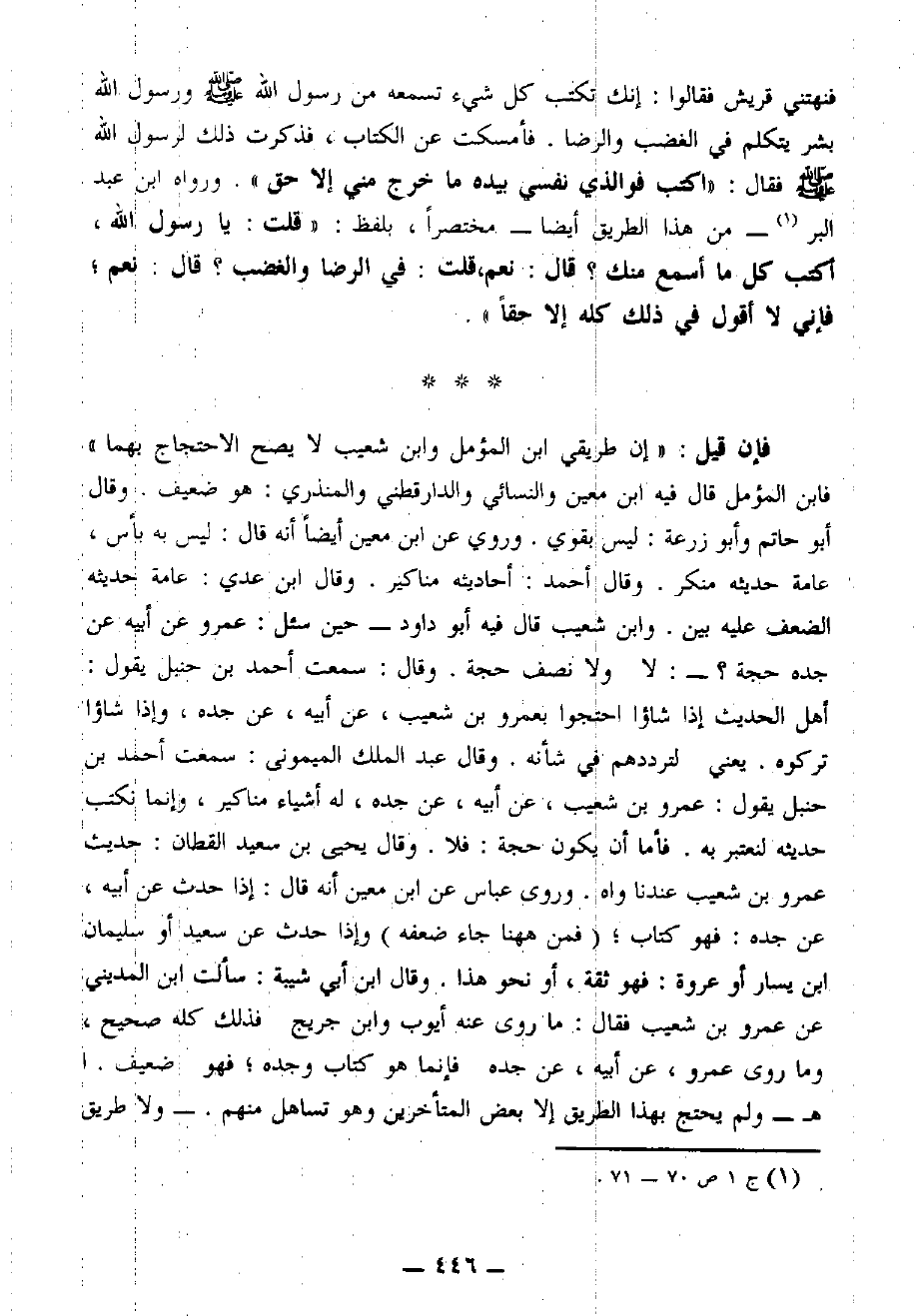 فإن قيل: «إن طريقي ابن المؤمل وابن شعيب لا يصح الاحتجاج بهما» فابن المؤمل قال فيه ابن معين والنسائي والدارقطني والمنذري: هو ضعيف. وقال أبو حاتم وأبو زُرعة: ليس بقوي. وروي عن ابن معين اَيْضًا أنه قال: ليس به بأس، عامة حديثه منكر، وقال أحمد: أحاديثه مناكير. وقال ابن عدي: عامة حديثه الضعف عليه بَيِّنٌ. وابن شعيب قال فيه أبو داود - حين سئل: عمرو عن أبيه عن جده حجة؟ -: لا، ولا نصف حجة. وقال: سمعت أحمد بن حنبل يقول: أهل الحديث إذا شاؤا احتجوا بعمرو بن شعيب، عن أبيه، عن جده، وإذا شاؤا تركوه. يعني لترددهم في شأنه. وقال عبد الملك الميموني: سمعت أحمد بن حنبل يقول: عمرو بن شعيب، عن أبيه، عن جده، له أشياء مناكير، وإنما نكتب حديثه لنعتبر به. فأما أن يكون حجة: فلا، وقال يحيى بن سعيد القطان: حديث عمرو بن شعيب عندنا واه. وروى عباس عن ابن معين أنه قال: إذا حدث عن أبيه، عن جده: فهو كتاب، (فمن ههنا جاء ضعفه) وإذا حدث عن سعيد أو سليمان بن يسار أو عُروة: فهو ثقة، أو نحو هذا. وقال ابن أبي شيبة: سألت ابن المديني عن عمرو بن شعيب فقال: ما روى عنه أيوب وابن جريج فذلك كله صحيح، وما روى عمرو، عن أبيه، عن جده فإنما هو كتاب وجده، فهو ضعيف. اهـ.