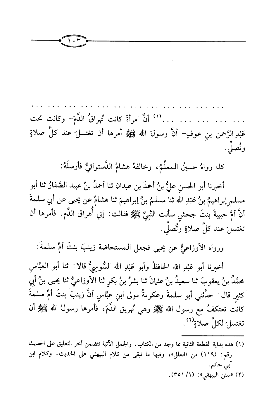 . . . . . . . . . . . . . . . . . . . . . . . . . . . . . . . . . . . . . . . . . . . . . . . . . . . . . . . . . . . . . . أَنَّ امْرَأَةً كَانَتْ تُهْرَاقُ الدَّمَ - وَكَانَتْ تَحْتَ عَبْدِ الرَّحْمَنِ بْنِ عَوْفٍ - أَنَّ رَسُولَ اللَّهِ صَلَّى اللَّهُ عَلَيْهِ وَسَلَّمَ أَمَرَهَا أَنْ تَغْتَسِلَ عِنْدَ كُلِّ صَلاةٍ وَتُصَلِّي.