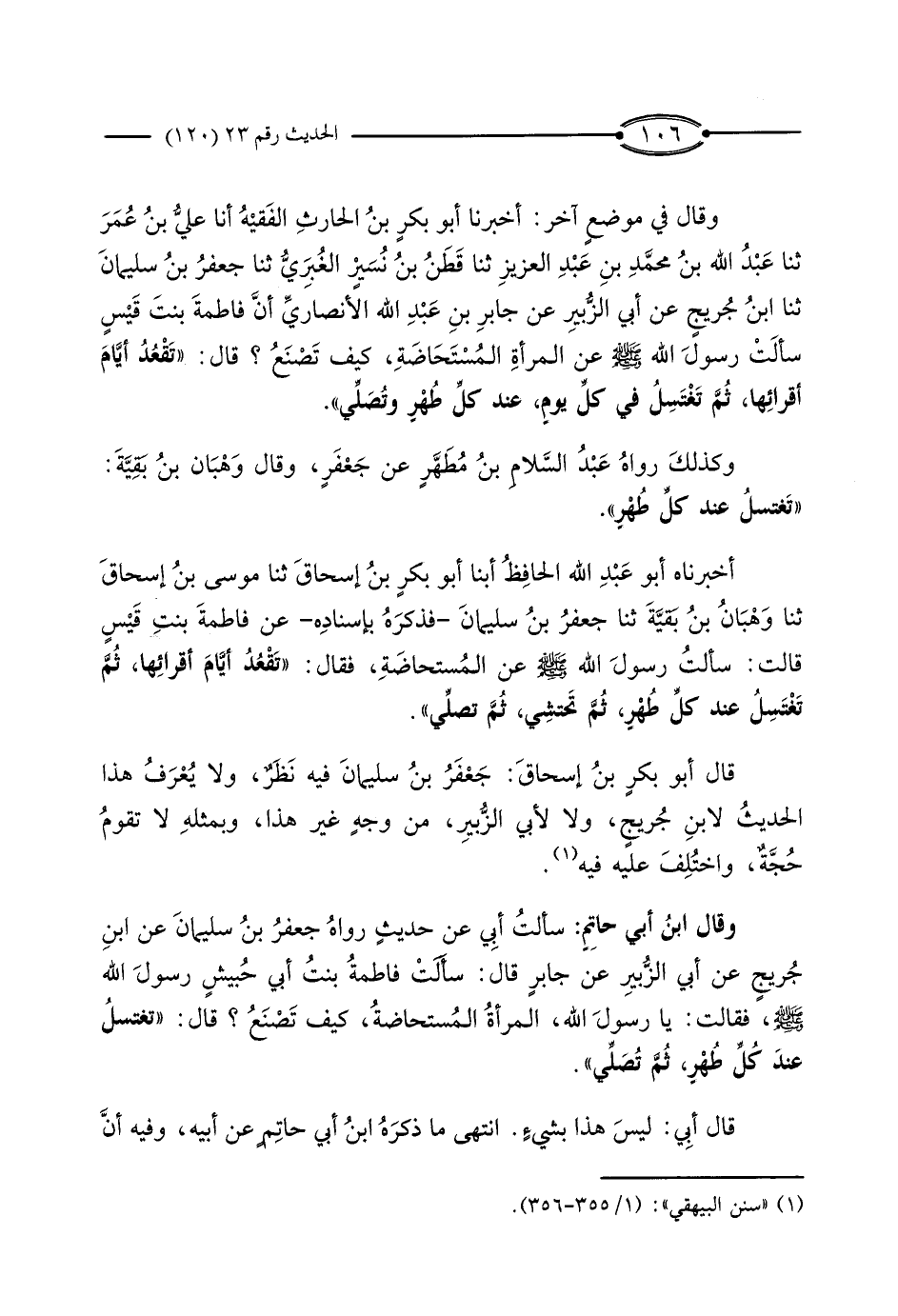 وَقَالَ ابْنُ أَبِي حَاتِمٍ: سَأَلْتُ أَبِي عَنْ حَدِيثٍ رَوَاهُ جَعْفَرُ بْنُ سُلَيْمَانَ، عَنِ ابْنِ جُرَيْجٍ، عَنْ أَبِي الزُّبَيْرِ، عَنْ جَابِرٍ، قَالَ: سَأَلَتْ فَاطِمَةُ بِنْتُ أَبِي حُبَيْشٍ رَسُولَ اللَّهِ صَلَّى اللَّهُ عَلَيْهِ وَسَلَّمَ فَقَالَتْ: يَا رَسُولَ اللَّهِ، الْمَرْأَةُ الْمُسْتَحَاضَةُ، كَيْفَ تَصْنَعُ؟ قَالَ: «تَغْتَسِلُ عَنْ كُلِّ طُهْرٍ، ثُمَّ تُصَلِّي» .