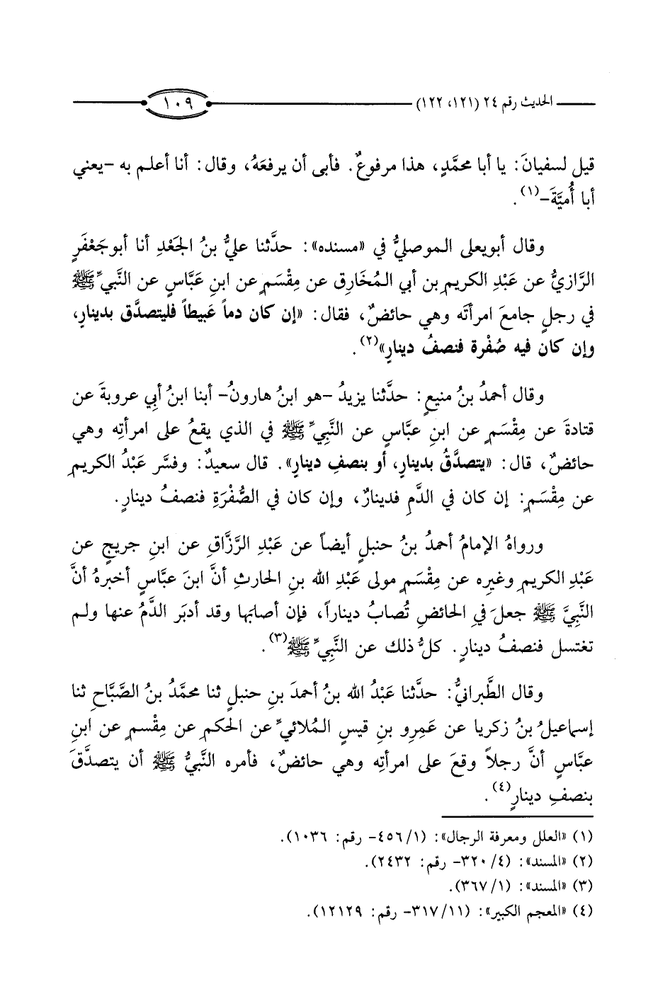 وَرَوَاهُ الإِمَامُ أَحْمَدُ بْنُ حَنْبَلٍ أَيْضًا، عَنْ عَبْدِ الرَّزَّاقِ، عَنْ ابْنِ جُرَيْجٍ، عَنْ عَبْدِ الْكَرِيمِ، وَغَيْرِهِ، عَنْ مِقْسَمٍ مَوْلَى عَبْدِ اللَّهِ بْنِ الْحَارِثِ، أَنَّ ابْنَ عَبَّاسٍ أَخْبَرَهُ، أَنَّ النَّبِيَّ صَلَّى اللَّهُ عَلَيْهِ وَسَلَّمَ جَعَلَ فِي الْحَائِضِ تُصَابُ دِينَارًا، فَإِنْ أَصَابَهَا وَقَدْ أَدْبَرَ الدَّمُ عَنْهَا وَلَمْ تَغْتَسِلْ فَنِصْفُ دِينَارٍ.