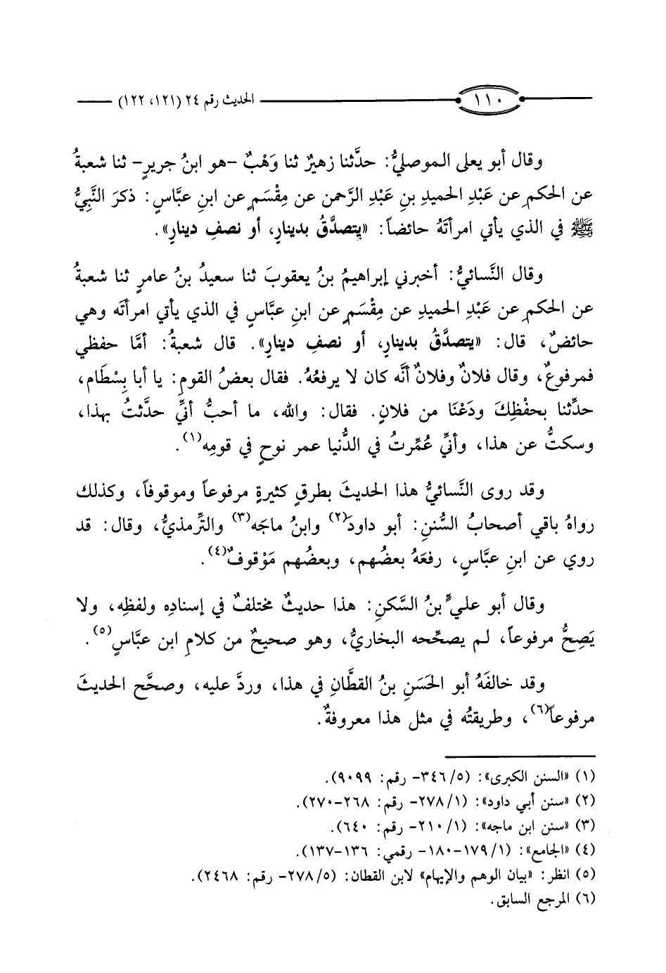 وَقَالَ النِّسَائِيُّ: أَخْبَرَنِي إِبْرَاهِيمُ بْنُ يَعْقُوبَ، ثَنَا سَعِيدُ بْنُ عَامِرٍ، ثَنَا شُعْبَةُ، عَنْ الْحَكَمِ، عَنْ عَبْدِ الْحَمِيدِ، عَنْ مِقْسَمٍ، عَنْ ابْنِ عَبَّاسٍ فِي الَّذِي يَأْتِي امْرَأَتَهُ وَهِيَ حَائِضٌ، قَالَ: «يَتَصَدَّقُ بِدِينَارٍ، أَوْ نِصْفِ دِينَارٍ» .