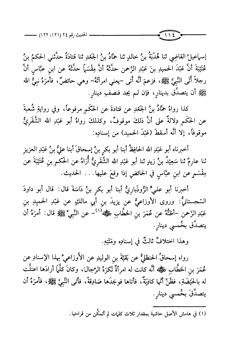 رَوَاهُ إِسْحَاقُ الْحَنْظَلِيُّ، عَنْ بَقِيَّةَ بْنِ الْوَلِيدِ، عَنْ الأَوْزَاعِيِّ، بِهَذَا الإِسْنَادِ، عَنْ عُمَرَ بْنِ الْخَطَّابِ رَضِيَ اللَّهُ عَنْهُ أَنَّهُ كَانَتْ لَهُ امْرَأَةٌ تَكْرَهُ الرِّجَالَ، وَكَانَ كُلَّمَا أَرَادَهَا اعْتَلَّتْ لَهُ بِالْحَيْضَةِ، فَظَنَّ أَنَّهَا كَاذِبَةٌ، فَأَتَاهَا فَوَجَدَهَا صَادِقَةً، فَأَتَى النَّبِيَّ صَلَّى اللَّهُ عَلَيْهِ وَسَلَّمَ، فَأَمَرَهُ أَنْ يَتَصَدَّقَ بِخُمْسَيْ دِينَارٍ.