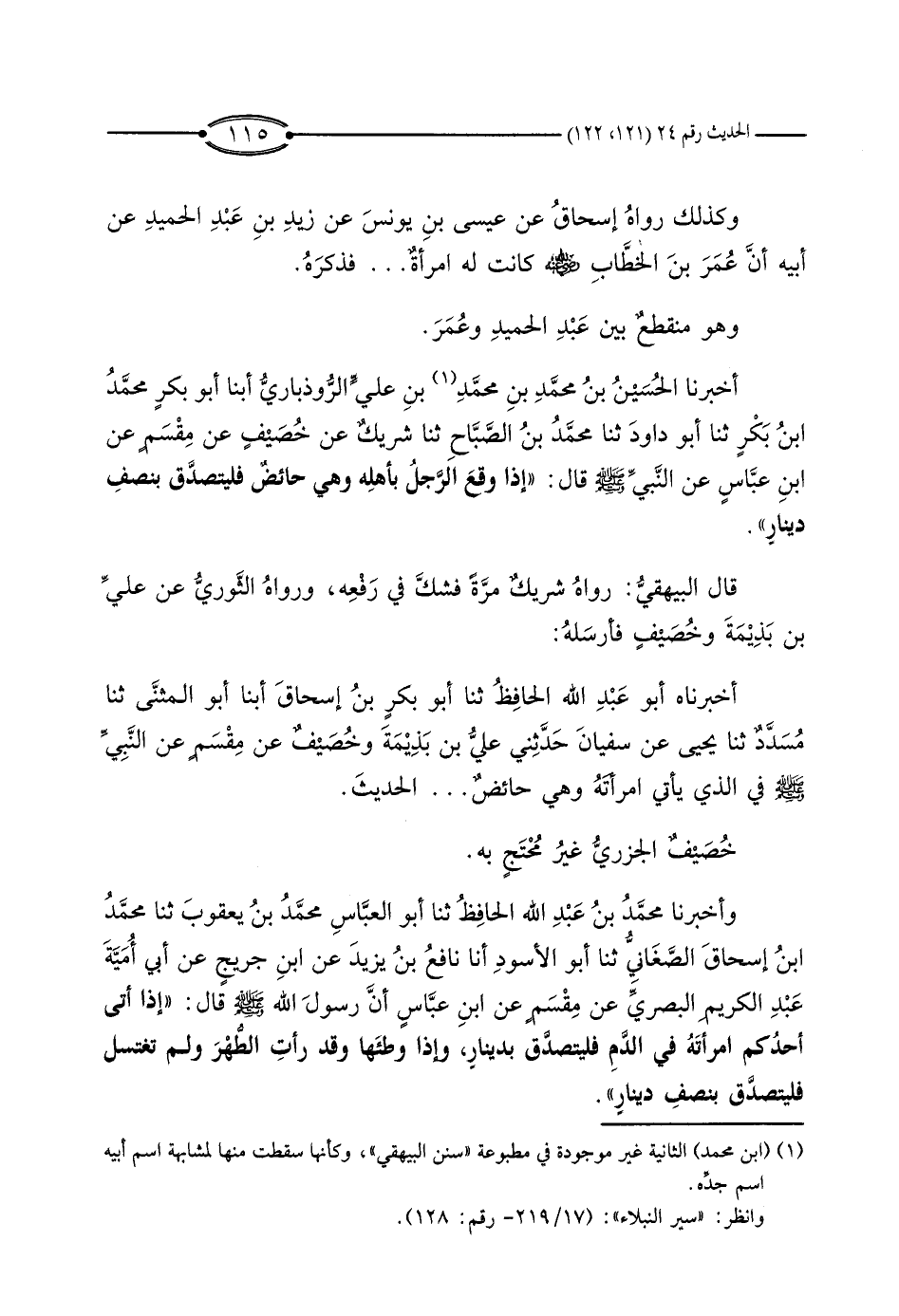 أَخْبَرَنَا الْحُسَيْنُ بْنُ مُحَمَّدِ بْنِ مُحَمَّدِ بْنِ عَلِيٍّ الرُّوذَبَارِيُّ، أَبْنَا أَبُو بَكْرٍ مُحَمَّدُ بْنُ بَكْرٍ، ثَنَا أَبُو دَاوُدَ، ثَنَا مُحَمَّدُ بْنُ الصَّبَّاحِ، ثَنَا شَرِيكٌ، عَنْ خُصَيْفٍ، عَنْ مِقْسَمٍ، عَنْ ابْنِ عَبَّاسٍ، عَنِ النَّبِيِّ صَلَّى اللَّهُ عَلَيْهِ وَسَلَّمَ قَالَ: «إِذَا وَقَعَ الرَّجُلُ بِأَهْلِهِ وَهِيَ حَائِضٌ فَلْيَتَصَدَّقْ بِنِصْفِ دِينَارٍ» .