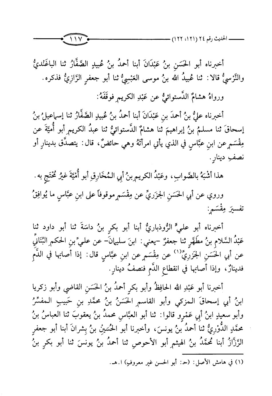 أَخْبَرَنَاهُ أَبُو عَلِيٍّ الرُّوذَبَارِيُّ، أَبْنَا أَبُو بَكْرِ بْنُ دَاسَةَ، ثَنَا أَبُو دَاوُدَ، ثَنَا عَبْدُ السَّلامِ بْنُ مُطَهَّرٍ، ثَنَا جَعْفَرٌ يَعْنِي: ابْنَ سُلَيْمَانَ، عَنْ عَلِيِّ بْنِ الْحَكَمِ الْبُنَانِيِّ، عَنْ أَبِي الْحَسَنِ الْجَزَرِيِّ، عَنْ مِقْسَمٍ، عَنْ ابْنِ عَبَّاسٍ، قَالَ: إِذَا أَصَابَهَا فِي الدَّمِ فَدِينَارٌ، وَإِذَا أَصَابَهَا فِي انْقِطَاعِ الدَّمِ فَنِصْفُ دِينَارٍ.
