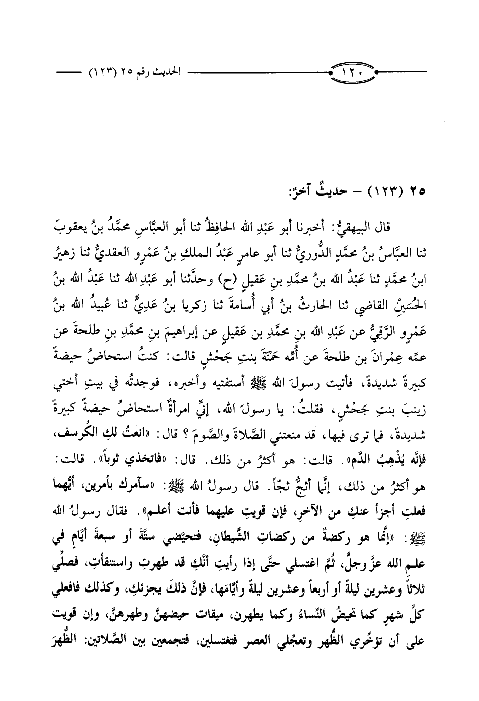 قَالَ الْبَيْهَقِيُّ: أَخْبَرَنَا أَبُو عَبْدِ اللَّهِ الْحَافِظُ، ثَنَا أَبُو الْعَبَّاسِ مُحَمَّدُ بْنُ يَعْقُوبَ، ثَنَا الْعَبَّاسُ بْنُ مُحَمَّدٍ الدُّورِيُّ، ثَنَا أَبُو عَامِرٍ عَبْدُ الْمَلِكِ بْنُ عَمْرٍو الْعَقَدِيُّ، ثَنَا زُهَيْرُ بْنُ مُحَمَّدٍ، ثَنَا عَبْدُ اللَّهِ بْنُ مُحَمَّدِ بْنِ عُقَيْلٍ، (ح) وَحَدَّثَنَا أَبُو عَبْدِ اللَّهِ، ثَنَا عَبْدُ اللَّهِ بْنُ الْحُسَيْنِ الْقَاضِي، ثَنَا الْحَارِثُ بْنُ أَبِي أُسَامَةَ، ثَنَا زَكَرِيَّا بْنُ عَدِيٍّ، ثَنَا عُبَيْدُ اللَّهِ بْنُ عَمْرٍو الرَّقِّيُّ، عَنْ عَبْدِ اللَّهِ بْنِ مُحَمَّدِ بْنِ عُقَيْلٍ، عَنْ إِبْرَاهِيمَ بْنِ مُحَمَّدِ بْنِ طَلْحَةَ، عَنْ عَمِّهِ عِمْرَانَ بْنِ طَلْحَةَ، عَنْ أُمِّهِ حَمْنَةَ بِنْتِ جَحْشٍ، قَالَتْ: كُنْتُ أُسْتَحَاضُ حَيْضَةً كَبِيرَةً شَدِيدَةً، فَأَتَيْتُ رَسُولَ اللَّهِ صَلَّى اللَّهُ عَلَيْهِ وَسَلَّمَ أَسْتَفْتِيهِ وَأُخْبِرُهُ، فَوَجَدْتُهُ فِي بَيْتِ أُخْتِي زَيْنَبَ بِنْتِ جَحْشٍ، فَقُلْتُ: يَا رَسُولَ اللَّهِ، إِنِّي امْرَأَةٌ أُسْتَحَاضُ حَيْضَةً كَبِيرَةً شَدِيدَةً، فَمَا تَرَى فِيهَا، قَدْ مَنَعَتْنِي الصَّلاةَ وَالصَّوْمَ؟ قَالَ: أَنْعَتُ لَكِ الْكُرْسُفَ، فَإِنَّهُ يُذْهِبُ الدَّمَ ".