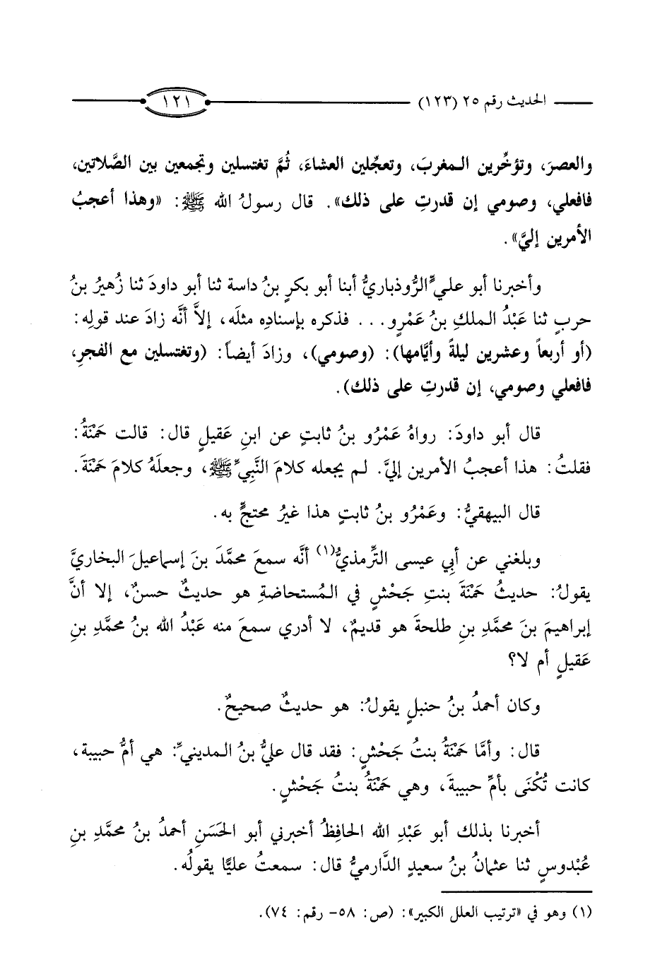 وَبَلَغَنِي عَنْ أَبِي عِيسَى التِّرْمِذِيِّ أَنَّهُ سَمِعَ مُحَمَّدَ بْنَ إِسْمَاعِيلَ الْبُخَارِيَّ، يَقُولُ: حَدِيثُ حَمْنَةَ بِنْتِ جَحْشٍ فِي الْمُسْتَحَاضَةِ هُوَ حَدِيثٌ حَسَنٌ، إِلا أَنَّ إِبْرَاهِيمَ بْنَ مُحَمَّدِ بْنِ طَلْحَةَ هُوَ قَدِيمٌ، لا أَدْرِي سَمِعَ مِنْهُ عَبْدُ اللَّهِ بْنُ مُحَمَّدِ بْنِ عُقَيْلٍ أَمْ لا؟ وَكَانَ أَحْمَدُ بْنُ حَنْبَلٍ يَقُولُ: هُوَ حَدِيثٌ صَحِيحٌ.