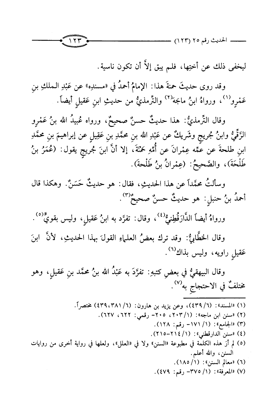 وَقَدْ رَوَى حَدِيثَ حَمْنَةَ هَذَا: الإِمَامُ أَحْمَدُ فِي «مُسْنَدِهِ» ، عَنْ عَبْدِ الْمَلِكِ بْنِ عَمْرٍو، وَرَوَاهُ ابْنُ مَاجَهْ، وَالتِّرْمِذِيُّ مِنْ حَدِيثِ ابْنِ عُقَيْلٍ أَيْضًا.