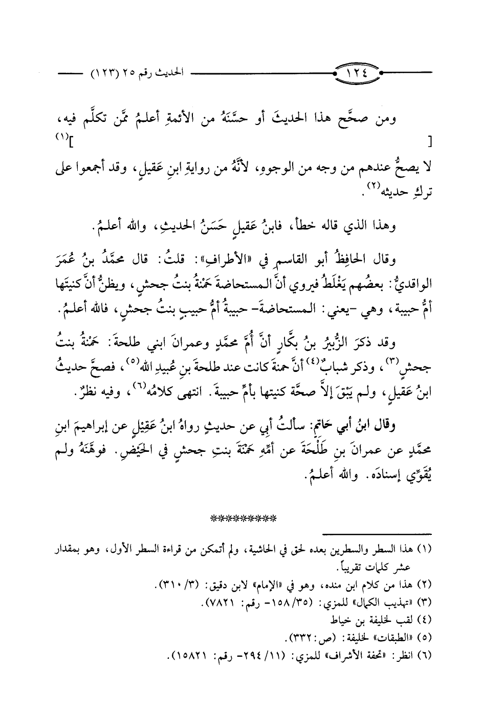وَمَنْ صَحَّحَ هَذَا الْحَدِيثَ أَوْ حَسَّنَهُ مِنَ الأَئِمَّةِ أَعْلَمُ مِمَّنْ تَكَلَّمَ فِيهِ، (. . . . . . . . . . . . . . . . . . . . . . . .) لا يَصِحُّ عِنْدَهُمْ مِنْ وَجْهٍ مِنَ الْوُجُوهِ؛ لأَنَّهُ مِنْ رِوَايَةِ ابْنِ عُقَيْلٍ، وَقَدْ أَجْمَعُوا عَلَى تَرْكِ حَدِيثِهِ.