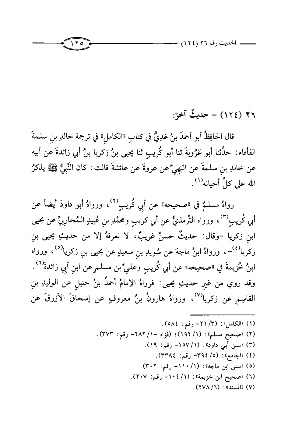 قَالَ الْحَافِظُ أَبُو أَحْمَدَ بْنُ عَدِيٍّ فِي كِتَابِ «الْكَامِلِ» فِي تَرْجَمَةِ خَالِدِ بْنِ سَلَمَةَ الفَأْفَاءِ، حَدَّثَنَا أَبُو عَرُوبَةَ، ثَنَا أَبُو كُرَيْبٍ، ثَنَا يَحْيَى بْنُ زَكَرِيَّا بْنِ أَبِي زَائِدَةَ، عَنْ أَبِيهِ، عَنْ خَالِدِ بْنِ سَلَمَةَ، عَنْ الْبَهِيِّ، عَنْ عُرْوَةَ، عَنْ عَائِشَةَ قَالَتْ: كَانَ النَّبِيُّ صَلَّى اللَّهُ عَلَيْهِ وَسَلَّمَ يَذْكُرُ اللَّهَ عَلَى كُلِّ أَحْيَانِهِ.
