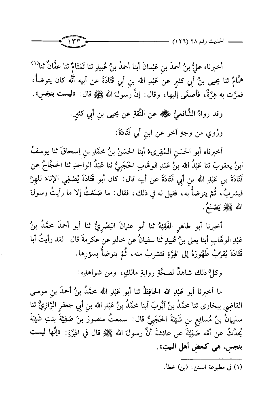 أَخْبَرَنَاهُ عَلِيُّ بْنُ أَحْمَدَ بْنِ عَبْدَانَ، أَبْنَا أَحْمَدُ بْنُ عُبَيْدٍ، ثَنَا تَمْتَامٌ، ثَنَا عَفَّانُ، ثَنَا هَمَّامٌ، ثَنَا يَحْيَى بْنُ أَبِي كَثِيرٍ، عَنْ عَبْدِ اللَّهِ بْنِ أَبِي قَتَادَةَ، عَنْ أَبِيهِ، أَنَّهُ كَانَ يَتَوَضَّأُ، فَمَرَّتْ بِهِ هِرَّةٌ، فَأَصْغَى إِلَيْهَا، وَقَالَ: إِنَّ رَسُولَ اللَّهِ صَلَّى اللَّهُ عَلَيْهِ وَسَلَّمَ قَالَ: «لَيْسَتْ بِنَجَسٍ» .