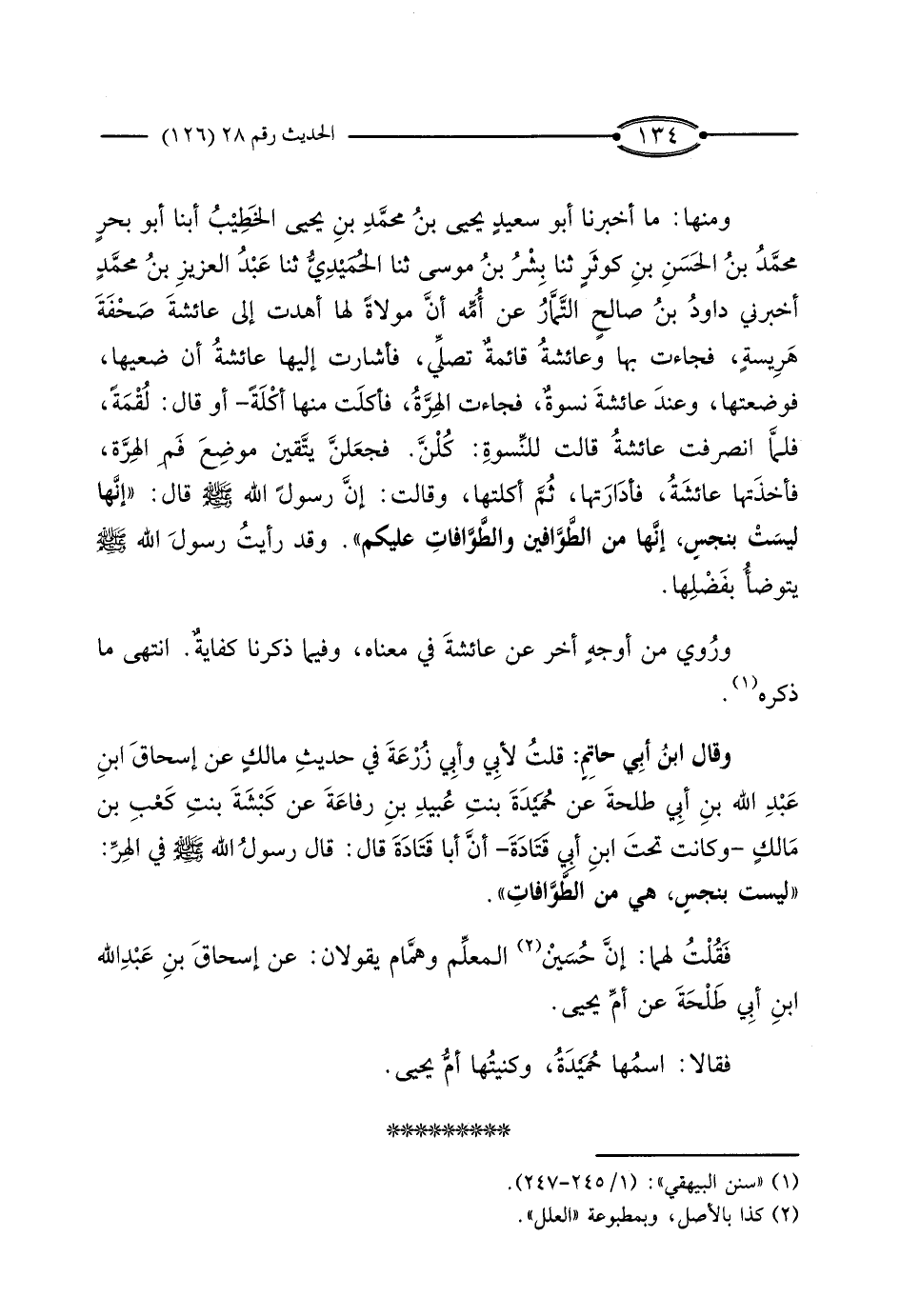 وَقَالَ ابْنُ أَبِي حَاتِمٍ: قُلْتُ لأَبِي وَأَبِي زُرْعَةَ فِي حَدِيثِ مَالِكٍ، عَنْ إِسْحَاقَ بْنِ عَبْدِ اللَّهِ بْنِ أَبِي طَلْحَةَ، عَنْ حُمَيْدَةَ بِنْتِ عُبَيْدِ بْنِ رِفَاعَةَ، عَنْ كَبْشَةَ بِنْتِ كَعْبِ بْنِ مَالِكٍ، وَكَانَتْ تَحْتَ ابْنِ أَبِي قَتَادَةَ، أَنَّ أَبَا قَتَادَةَ، قَالَ: قَالَ رَسُولُ اللَّهِ صَلَّى اللَّهُ عَلَيْهِ وَسَلَّمَ فِي الْهِرِّ: «لَيْسَتْ بِنَجَسٍ، هِيَ مِنَ الطَّوَّافَاتِ» .