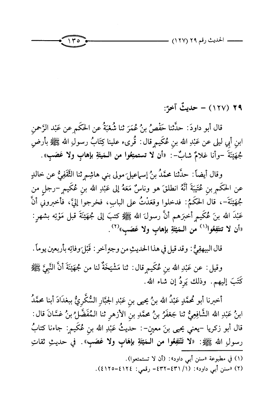 قَالَ أَبُو دَاوُدَ: حَدَّثَنَا حَفْصُ بْنُ عُمَرَ، ثَنَا شُعْبَةُ، عَنْ الْحَكَمِ، عَنْ عَبْدِ الرَّحْمَنِ بْنِ أَبِي لَيْلَى، عَنْ عَبْدِ اللَّهِ بْنِ عُكَيْمٍ، قَالَ: قُرِئَ عَلَيْنَا كِتَابُ رَسُولِ اللَّهِ صَلَّى اللَّهُ عَلَيْهِ وَسَلَّمَ بِأَرْضِ جُهَيِنَةَ وَأَنَا غُلامٌ شَابٌّ: أَنْ لا تَسْتَمْتِعُوا مِنَ الْمَيْتَةِ بِإِهَابٍ وَلا عَصَبٍ ".