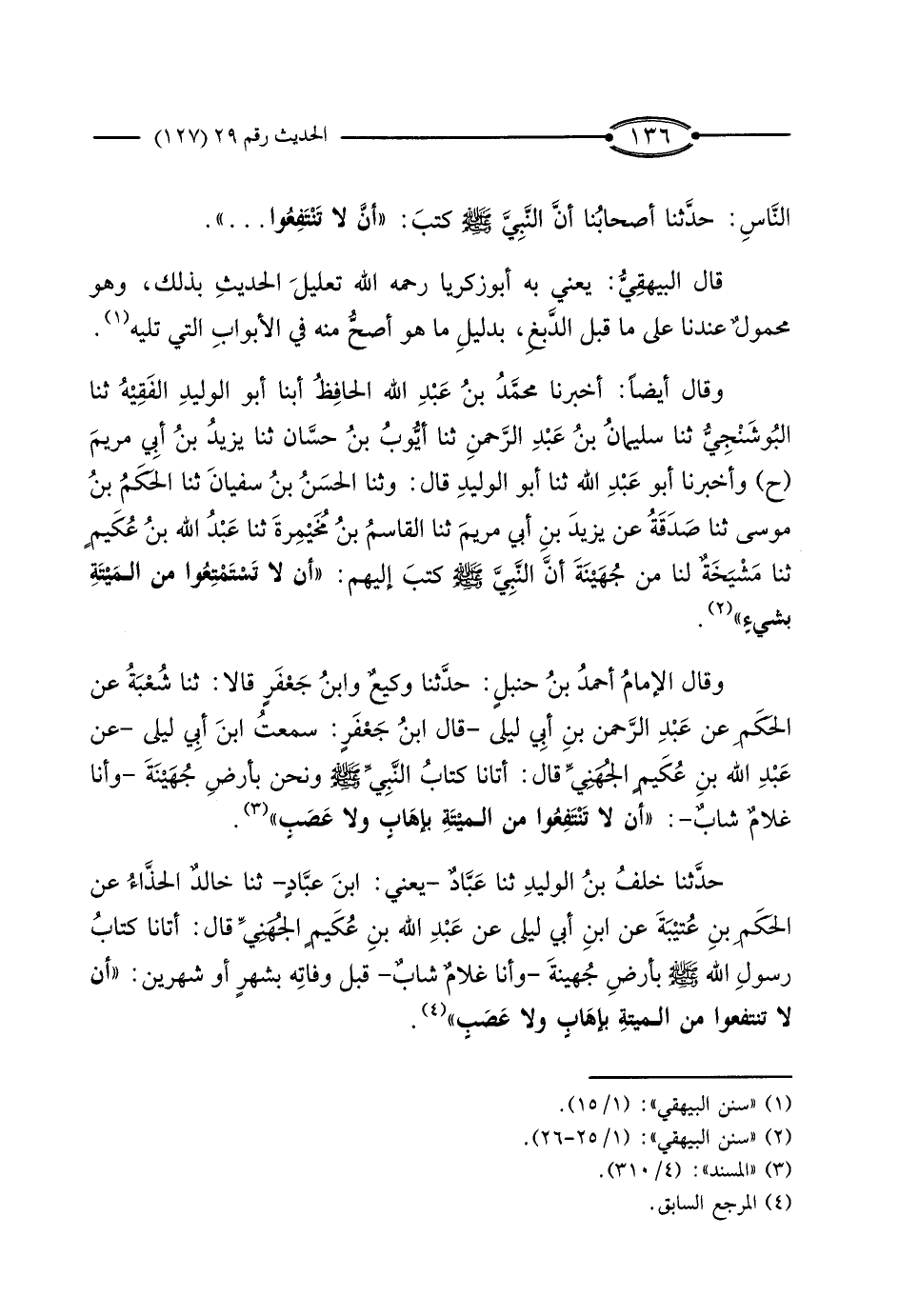وَقَالَ الإِمَامُ أَحْمَدُ بْنُ حَنْبَلٍ: حَدَّثَنَا وَكِيعٌ، وَابْنُ جَعْفَرٍ، قَالا: ثَنَا شُعْبَةُ، عَنْ الْحَكَمِ، عَنْ عَبْدِ الرَّحْمَنِ بْنِ أَبِي لَيْلَى، قَالَ ابْنُ جَعْفَرٍ: سَمِعْتُ ابْنَ أَبِي لَيْلَى، عَنْ عَبْدِ اللَّهِ بْنِ عُكَيْمٍ الْجُهَنِيِّ قَالَ: أَتَانَا كِتَابُ النَّبِيِّ صَلَّى اللَّهُ عَلَيْهِ وَسَلَّمَ وَنَحْنُ بِأَرْضِ جُهَيْنَةَ وَأَنَا غُلامٌ شَابٌّ: أَنْ لا تَنْتَفِعُوا مِنَ الْمَيْتَةِ بِإِهَابٍ وَلا عَصَبٍ ".