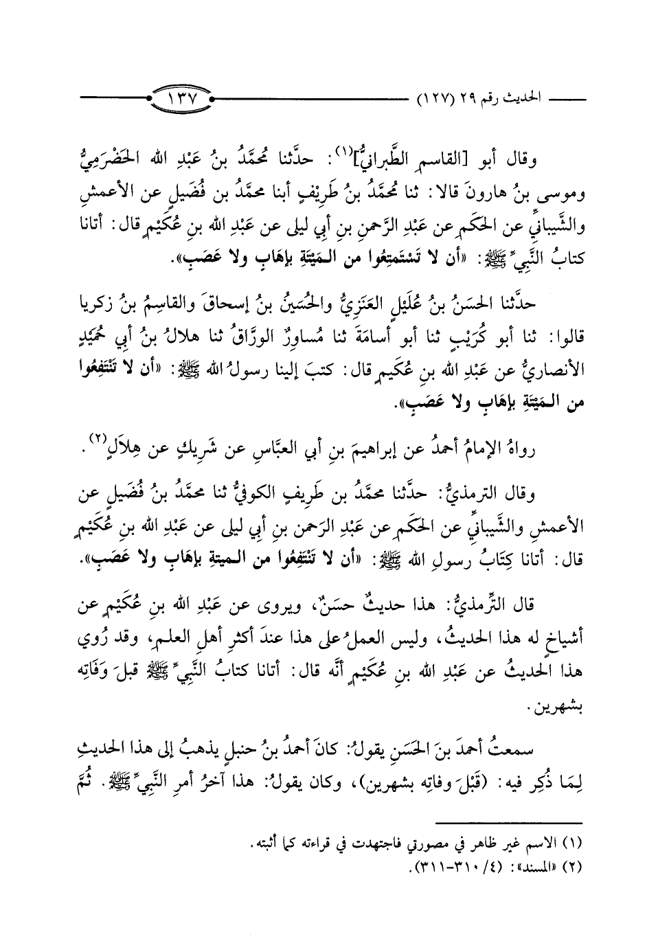 وَقَالَ التِّرْمِذِيُّ: حَدَّثَنَا مُحَمَّدُ بْنُ طَرِيفٍ الْكُوفِيُّ، ثَنَا مُحَمَّدُ بْنُ فُضَيْلٍ، عَنْ الأَعْمَشِ، وَالشَّيْبَانِيِّ، عَنْ الْحَكَمِ، عَنْ عَبْدِ الرَّحْمَنِ بْنِ أَبِي لَيْلَى، عَنْ عَبْدِ اللَّهِ بْنِ عُكَيْمٍ، قَالَ: أَتَانَا كِتَابُ رَسُولِ اللَّهِ صَلَّى اللَّهُ عَلَيْهِ وَسَلَّمَ: أَنْ لا تَنْتَفِعُوا مِنَ الْمَيْتَةِ بِإِهَابٍ وَلا عَصَبٍ ".