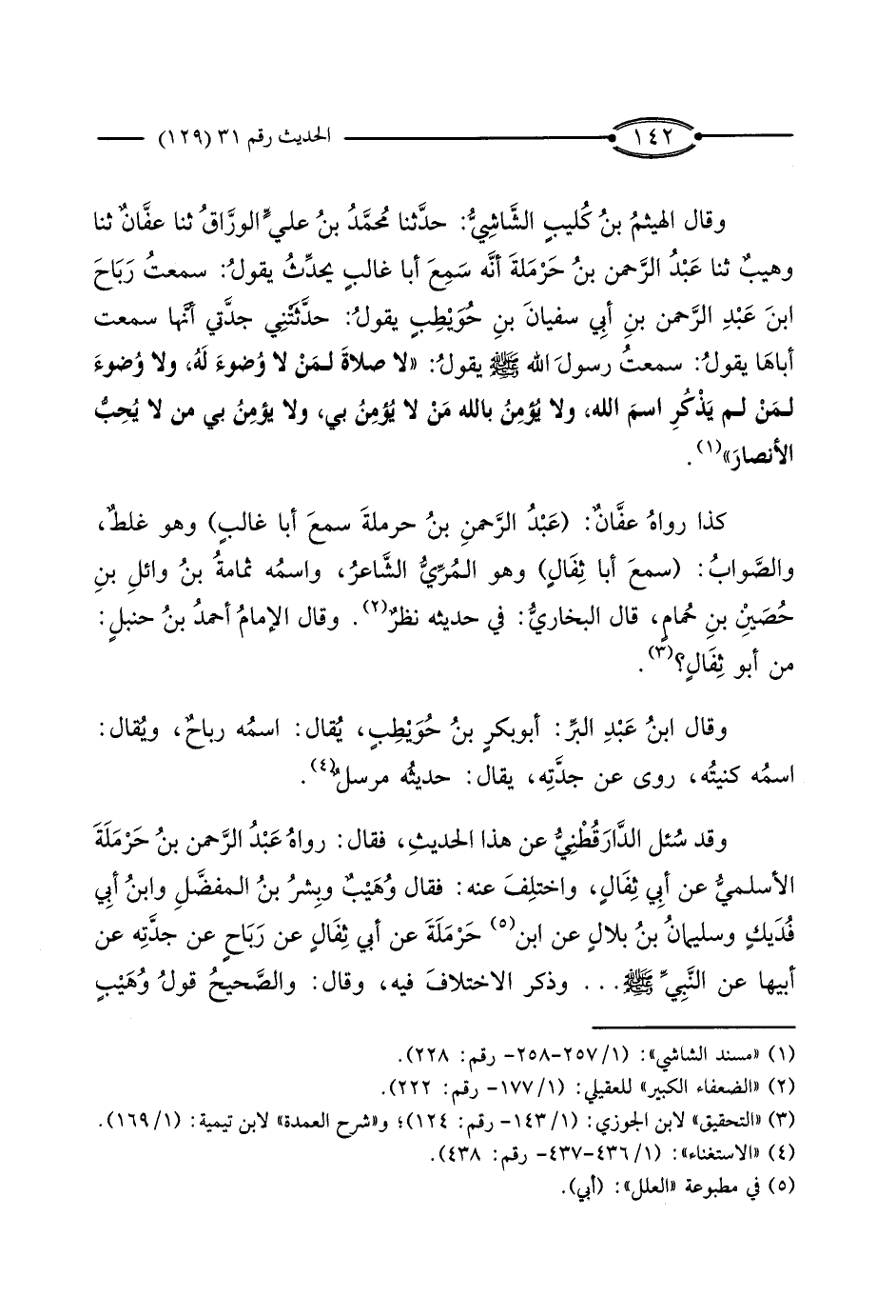 وَقَدْ سُئِلَ الدَّارَاقُطْنِيُّ عَنْ هَذَا الْحَدِيثِ، فَقَالَ: رَوَاهُ عَبْدُ الرَّحْمَنِ بْنُ حَرْمَلَةَ الأَسْلَمِيُّ، عَنْ أَبِي ثِفَالٍ، وَاخْتُلِفَ عَنْهُ: فَقَالَ وُهَيْبٌ، وَبِشْرُ بْنُ الْمُفَضَّلِ، وَابْنُ أَبِي فُدَيْكٍ، وَسُلَيْمَانُ بْنُ بِلالٍ، عَنِ ابْنِ حَرْمَلَةَ، عَنْ أَبِي ثِفَالٍ، عَنْ رَبَاحٍ، عَنْ جَدَّتِهِ، عَنْ أَبِيهَا، عَنِ النَّبِيِّ صَلَّى اللَّهُ عَلَيْهِ وَسَلَّمَ. . . وَذَكَرَ الاخْتِلافَ فِيهِ، وَقَالَ: وَالصَّحِيحُ قَوْلُ وُهَيْبٍ،