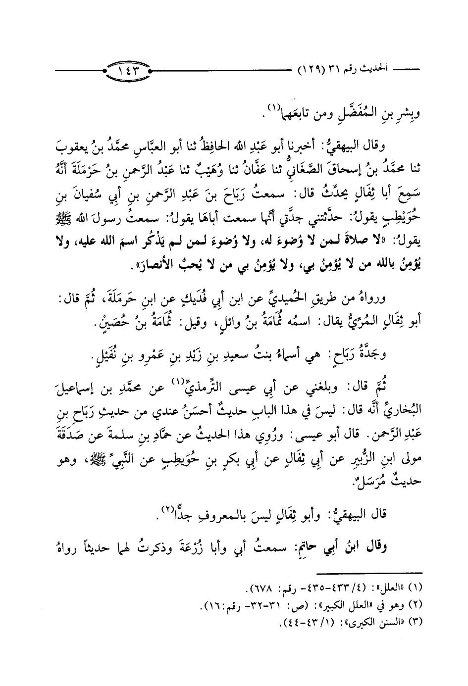 وَقَالَ الْبَيْهَقِيُّ: أَخْبَرَنَا أَبُو عَبْدِ اللَّهِ الْحَافِظُ، ثَنَا أَبُو الْعَبَّاسِ مُحَمَّدُ بْنُ يَعْقُوبَ، ثَنَا مُحَمَّدُ بْنُ إِسْحَاقَ الصَّغَانِيُّ، ثَنَا عَفَّانُ، ثَنَا وُهَيْبٌ، ثَنَا عَبْدُ الرَّحْمَنِ بْنُ حَرْمَلَةَ، أَنَّهُ سَمِعَ أَبَا ثِفَالٍ يُحَدِّثُ، قَالَ: سَمِعْتُ رَبَاحَ بْنَ عَبْدِ الرَّحْمَنِ بْنِ أَبِي سُفْيَانَ بْنِ حُوَيْطِبٍ، يَقُولُ: حَدَّثَتْنِي جَدَّتِي، أَنَّهَا سَمِعَتْ أَبَاهَا يَقُولُ: سَمِعْتُ رَسُولَ اللَّهِ صَلَّى اللَّهُ عَلَيْهِ وَسَلَّمَ يَقُولُ: «لا صَلاةَ لِمَنْ لا وُضُوءَ لَهُ، وَلا وُضُوءَ لِمَنْ لَمْ يَذْكُرِ اسْمَ اللَّهِ عَلَيْهِ، وَلا يُؤْمِنُ بِاللَّهِ مَنْ لا يُؤْمِنُ بِي، وَلا يُؤْمِنُ بِي مَنْ لا يُحِبُّ الأَنْصَارَ» .