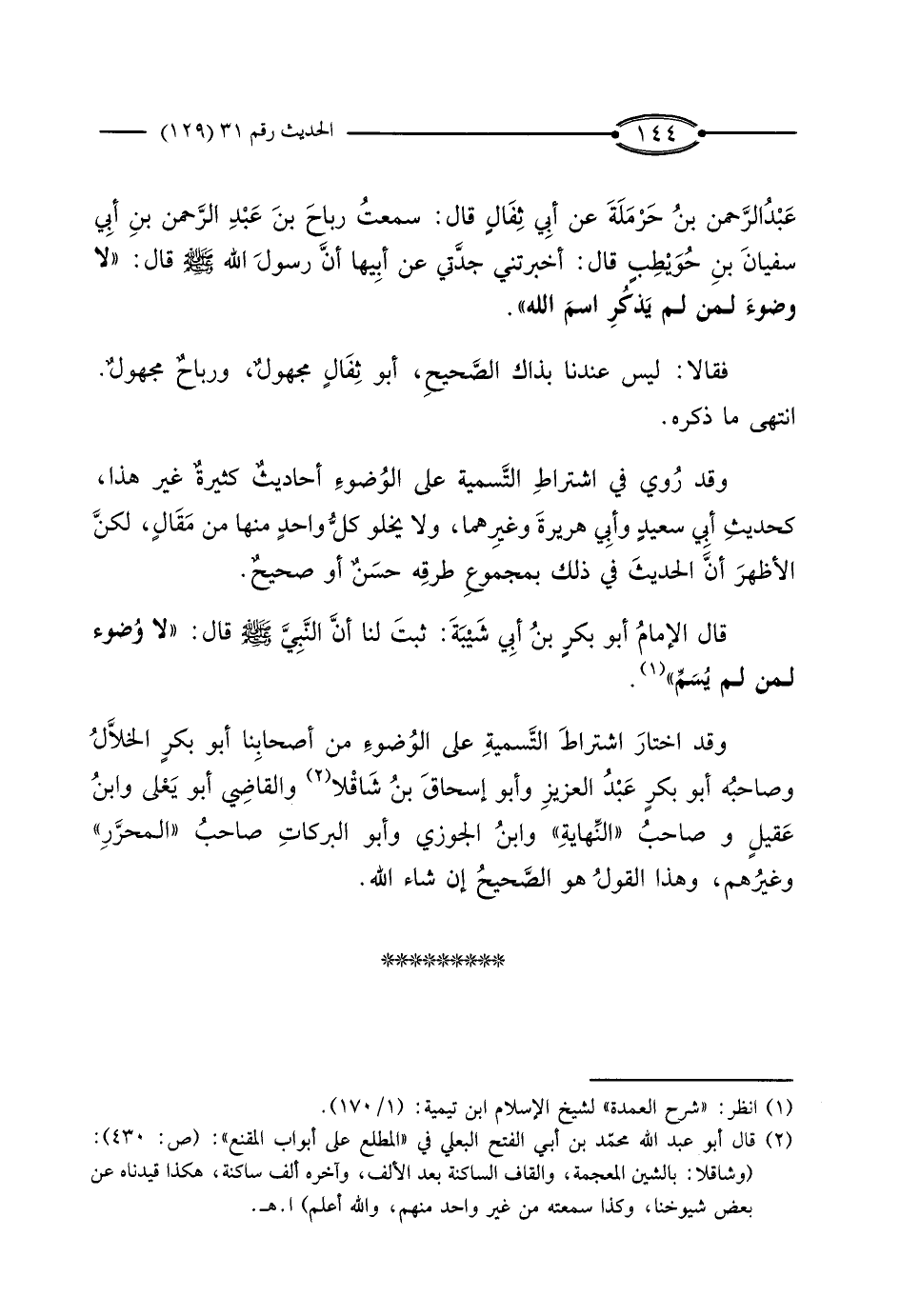 وَقَدْ اخْتَارَ اشْتِرَاطَ التَّسْمِيَةِ عَلَى الْوُضُوءِ مِنْ أَصْحَابِنَا أَبُو بَكْرٍ الْخَلَّالُ وَصَاحِبُهُ أَبُو بَكْرٍ عَبْدُ الْعَزِيزِ وَأَبُو إِسْحَاقَ بْنُ شَاقْلا وَالْقَاضِي أَبُو يَعْلَى وَابْنُ عُقَيْلٍ وَصَاحِبُ «النِّهَايَةِ» وَابْنُ الْجَوْزِيِّ وَأَبُو الْبَرَكَاتِ صَاحِبُ «الْمُحَرَّرِ» وَغَيْرُهُمْ، وَهَذَا الْقَوْلُ هُوَ الصَّحِيحُ إِنْ شَاءَ اللَّهُ.