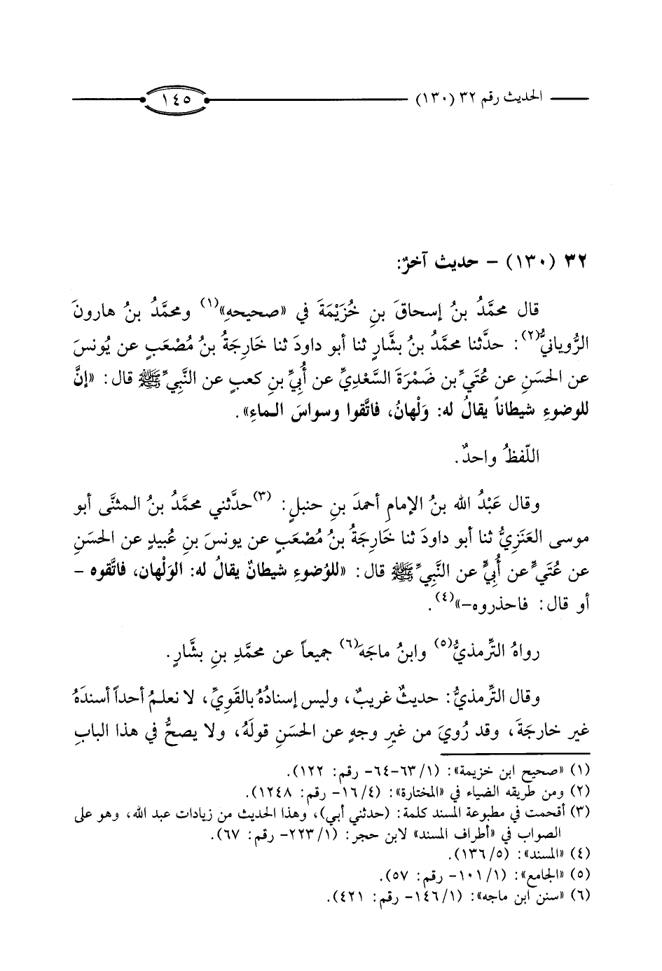 قَالَ مُحَمَّدُ بْنُ إِسْحَاقَ بْنِ خُزَيْمَةَ فِي «صَحِيحِهِ» ، وَمُحَمَّدُ بْنُ هَارُونَ الرُّويَانِيُّ،: حَدَّثَنَا مُحَمَّدُ بْنُ بَشَّارٍ، ثَنَا أَبُو دَاوُدَ، ثَنَا خَارِجَةُ بْنُ مُصْعَبٍ، عَنْ يُونُسَ، عَنْ الْحَسَنِ، عَنْ عُتَيِّ بْنِ ضَمْرَةَ السَّعْدِيِّ، عَنْ أُبَيِّ بْنِ كَعْبٍ، عَنِ النَّبِيِّ صَلَّى اللَّهُ عَلَيْهِ وَسَلَّمَ قَالَ: إِنَّ لِلْوُضُوءِ شَيْطَانًا يُقَالُ لَهُ: وَلَهَانُ، فَاتَّقُوا وَسْوَاسَ الْمَاءِ ".