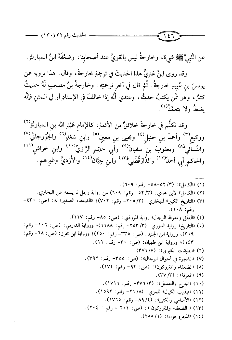 وَقَدْ تَكَلَّمَ فِي خَارِجَةَ خَلائِقُ مِنَ الأَئِمَّةِ، كَالإِمَامِ عَبْدِ اللَّهِ بْنِ الْمُبَارَكِ، وَوَكِيعٍ، وَأَحْمَدَ بْنِ حَنْبَلٍ، وَيَحْيَى بْنِ مَعِينٍ، وَابْنِ سَعْدٍ، وَالْجُوزْجَانِيِّ، وَالنَّسَائِيِّ، وَيَعْقُوبَ بْنِ سُفْيَانَ، وَأَبِي حَاتِمٍ الرَّازِيِّ، وَابْنِ خِرَاشٍ، وَالْحَاكِمِ أَبِي أَحْمَدَ، وَالدَّارَقُطْنِيِّ، وَابْنِ حِبَّانَ، وَالأَزْدِيِّ وَغَيْرِهِمْ.