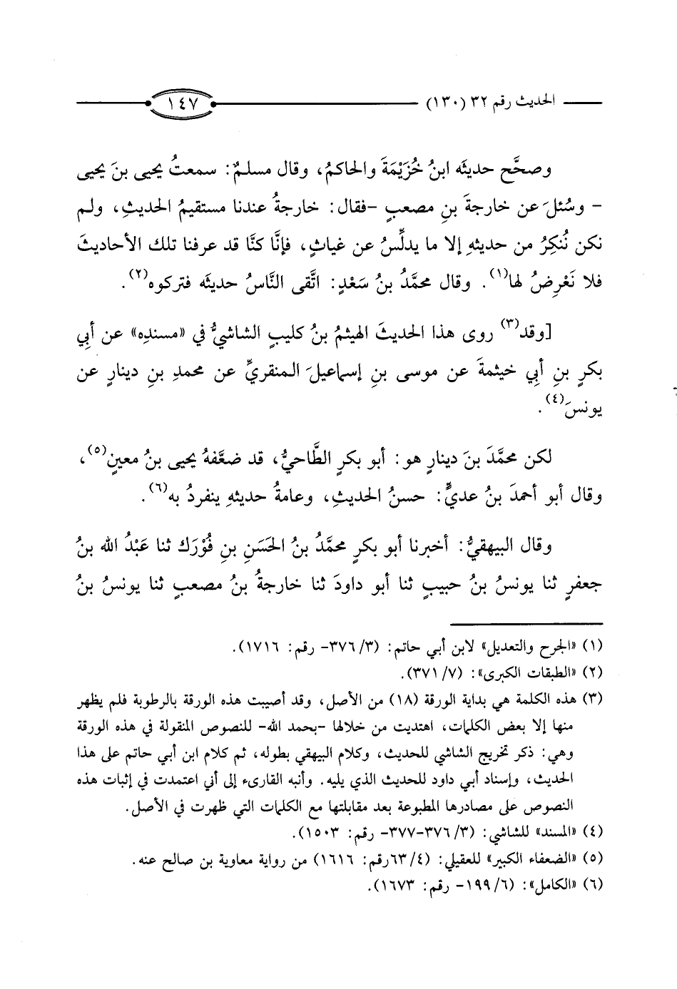 وَقَدْ رَوَى هَذَا الْحَدِيثَ الْهَيْثَمُ بْنُ كُلَيْبٍ الشَّاشِيُّ فِي «مُسْنَدِهِ» ، عَنْ أَبِي بَكْرِ بْنِ أَبِي خَيْثَمَةَ، عَنْ مُوسَى بْنِ إِسْمَاعِيلَ الْمِنْقَرِيِّ، عَنْ مُحَمَّدِ بْنِ دِينَارٍ، عَنْ يُونُسَ.