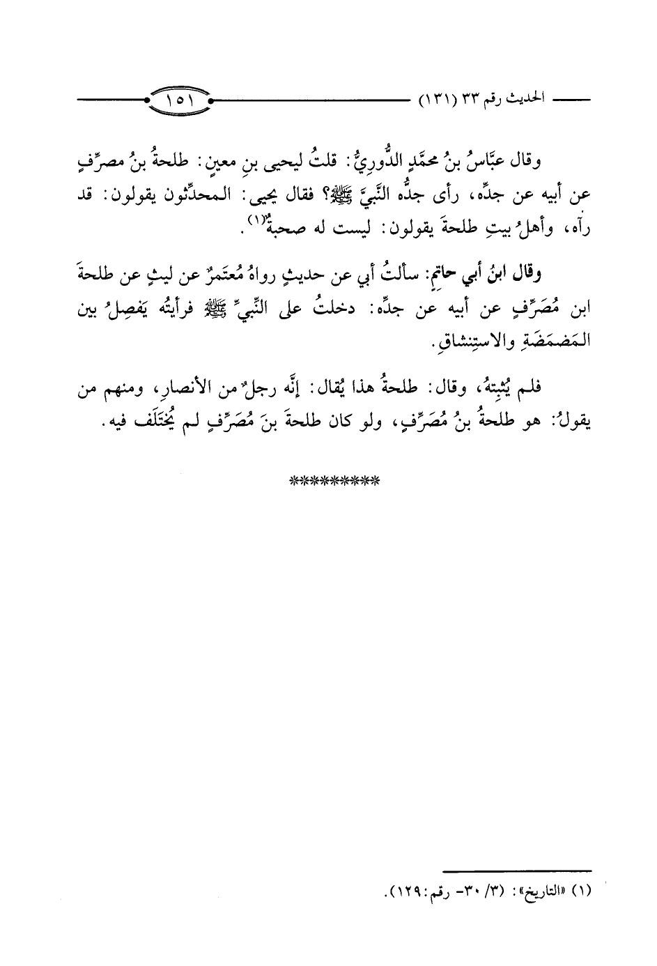 فَلَمْ يُثْبِتْهُ، وَقَالَ: طَلْحَةُ هَذَا يُقَالُ: إِنَّهُ رَجُلٌ مِنَ الأَنْصَارِ، وَمِنْهُمْ مَنْ يَقُولُ: هُوَ طَلْحَةُ بْنُ مُصَرِّفٍ، وَلَوْ كَانَ طَلْحَةُ بْنُ مُصَرِّفٍ لَمْ يُخْتَلَفْ فِيهِ.