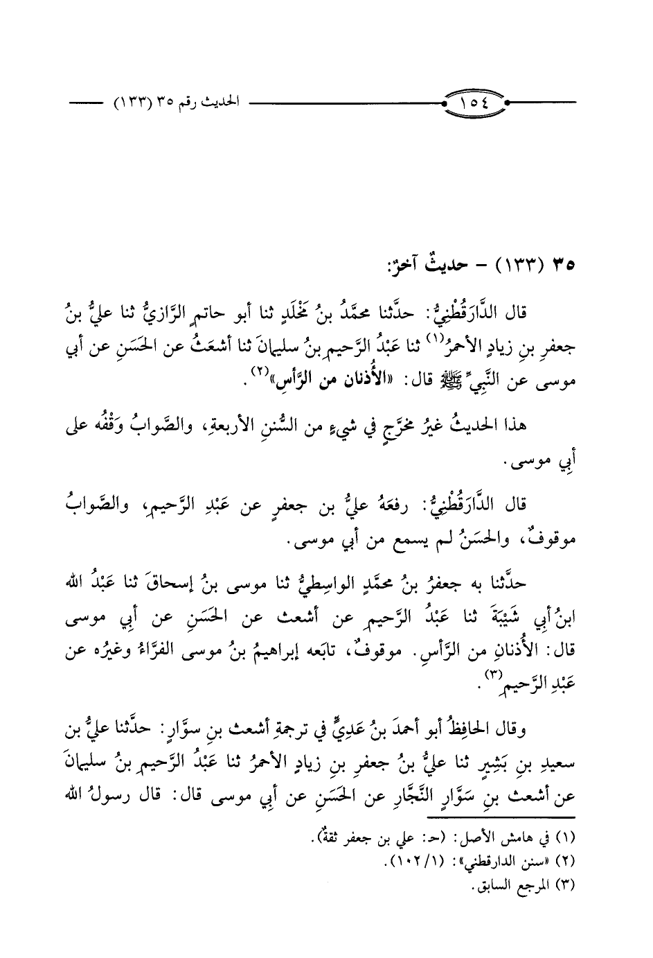 قَالَ الدَّارَقُطْنِيُّ: حَدَّثَنَا مُحَمَّدُ بْنُ مَخْلَدٍ، ثَنَا أَبُو حَاتِمٍ الرَّازِيُّ، ثَنَا عَلِيُّ بْنُ جَعْفَرِ بْنِ زِيَادٍ الأَحْمَرُ، ثَنَا عَبْدُ الرَّحِيمِ بْنُ سُلَيْمَانَ، ثَنَا أَشْعَثُ، عَنْ الْحَسَنِ، عَنْ أَبِي مُوسَى، عَنِ النَّبِيِّ صَلَّى اللَّهُ عَلَيْهِ وَسَلَّمَ قَالَ: «الأُذُنَانِ مِنَ الرَّأْسِ» .