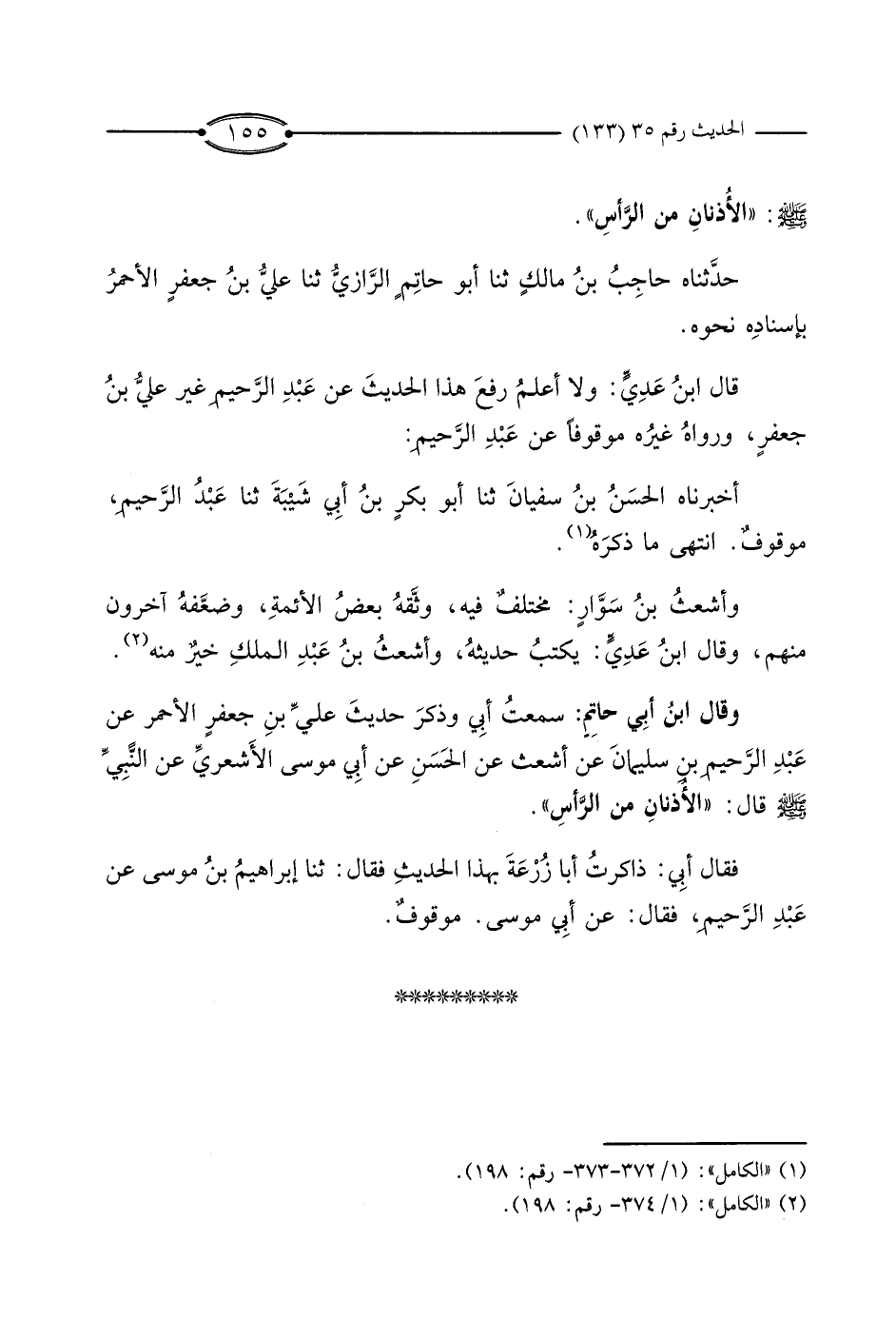 وَقَالَ ابْنُ أَبِي حَاتِمٍ: سَمِعْتُ أَبِي، وَذَكَرَ حَدِيثَ عَلِيِّ بْنِ جَعْفَرٍ الأَحْمَرِ، عَنْ عَبْدِ الرَّحِيمِ بْنِ سُلَيْمَانَ، عَنْ أَشْعَثَ، عَنِ الْحَسَنِ، عَنْ أَبِي مُوسَى الأَشْعَرِيِّ عَنِ النَّبِيِّ صَلَّى اللَّهُ عَلَيْهِ وَسَلَّمَ قَالَ: «الأُذُنَانِ مِنَ الرَّأْسِ» .