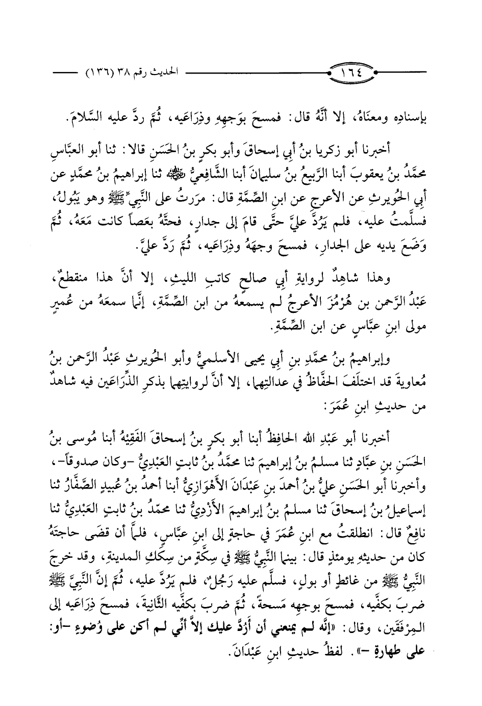 أَخْبَرَنَا أَبُو عَبْدِ اللَّهِ الْحَافِظُ، أَبْنَا أَبُو بَكْرِ بْنُ إِسْحَاقَ الْفَقِيهُ، أَبْنَا مُوسَى بْنُ الْحَسَنِ بْنِ عَبَّادٍ، ثَنَا مُسْلِمُ بْنُ إِبْرَاهِيمَ، ثَنَا مُحَمَّدُ بْنُ ثَابِتٍ الْعَبْدِيُّ وَكَانَ صَدُوقًا، وَأَخْبَرَنَا أَبُو الْحَسَنِ عَلِيُّ بْنُ أَحْمَدَ بْنِ عَبْدَانَ الأَهْوَازِيُّ، أَبْنَا أَحْمَدُ بْنُ عُبَيْدٍ الصَّفَّارُ، ثَنَا إِسْمَاعِيلُ بْنُ إِسْحَاقَ، ثَنَا مُسْلِمُ بْنُ إِبْرَاهِيمَ الأَزْدِيُّ، ثَنَا مُحَمَّدُ بْنُ ثَابِتٍ الْعَبْدِيُّ، ثَنَا نَافِعٌ، قَالَ: انْطَلَقْتُ مَعَ ابْنِ عُمَرَ فِي حَاجَةٍ إِلَى ابْنِ عَبَّاسٍ، فَلَمَّا أَنْ قَضَى حَاجَتَهُ كَانَ مِنْ حَدِيثِهِ يَوْمَئِذٍ قَالَ: بَيْنَمَا النَّبِيُّ صَلَّى اللَّهُ عَلَيْهِ وَسَلَّمَ فِي سِكَّةٍ مِنْ سِكَكِ الْمَدِينَةِ، وَقَدْ خَرَجَ النَّبِيُّ صَلَّى اللَّهُ عَلَيْهِ وَسَلَّمَ مِنْ غَائِطٍ أَوْ بَوْلٍ، فَسَلَّمَ عَلَيْهِ رَجُلٌ، فَلَمْ يَرُدَّ عَلَيْهِ، ثُمَّ إِنَّ النَّبِيَّ صَلَّى اللَّهُ عَلَيْهِ وَسَلَّمَ ضَرَبَ بِكَفَّيْهِ، فَمَسَحَ بِوَجْهِهِ مَسْحَةً، ثُمَّ ضَرَبَ بِكَفَّيْهِ الثَّانِيَةِ، فَمَسَحَ ذِرَاعَيْهِ إِلَى الْمِرْفَقَيْنِ وَقَالَ: إِنَّهُ لَمْ يَمْنَعْنِي أَنْ أَرُدَّ عَلَيْكَ إِلا أَنِّي لَمْ أَكُنْ عَلَى وُضُوءٍ أَوْ: عَلَى طَهَارَةٍ ".