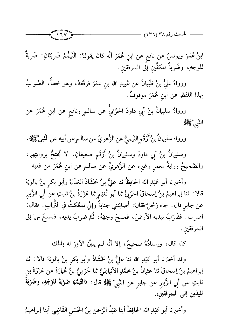 وَقَدْ أَخْبَرَنَا أَبُو عَبْدِ اللَّهِ، ثَنَا عَلِيُّ بْنُ حَمْشَاذَ، وَأَبُو بَكْرٍ ابْنُ بَالُوَيْهِ، قَالا: ثَنَا إِبْرَاهِيمُ بْنُ إِسْحَاقَ، ثَنَا عُثْمَانُ بْنُ مُحَمَّدٍ الأَنْمَاطِيُّ، ثَنَا حَرَمِيُّ بْنُ عُمَارَةَ، عَنْ عَزْرَةَ بْنِ ثَابِتٍ، عَنْ أَبِي الزُّبَيْرِ، عَنْ جَابِرٍ، عَنِ النَّبِيِّ صَلَّى اللَّهُ عَلَيْهِ وَسَلَّمَ قَالَ: «التَّيَمُّمُ ضَرْبَةٌ لِلْوَجْهِ، وَضَرْبَةٌ لِلْيَدَيْنِ إِلَى الْمِرْفَقَيْنِ» .