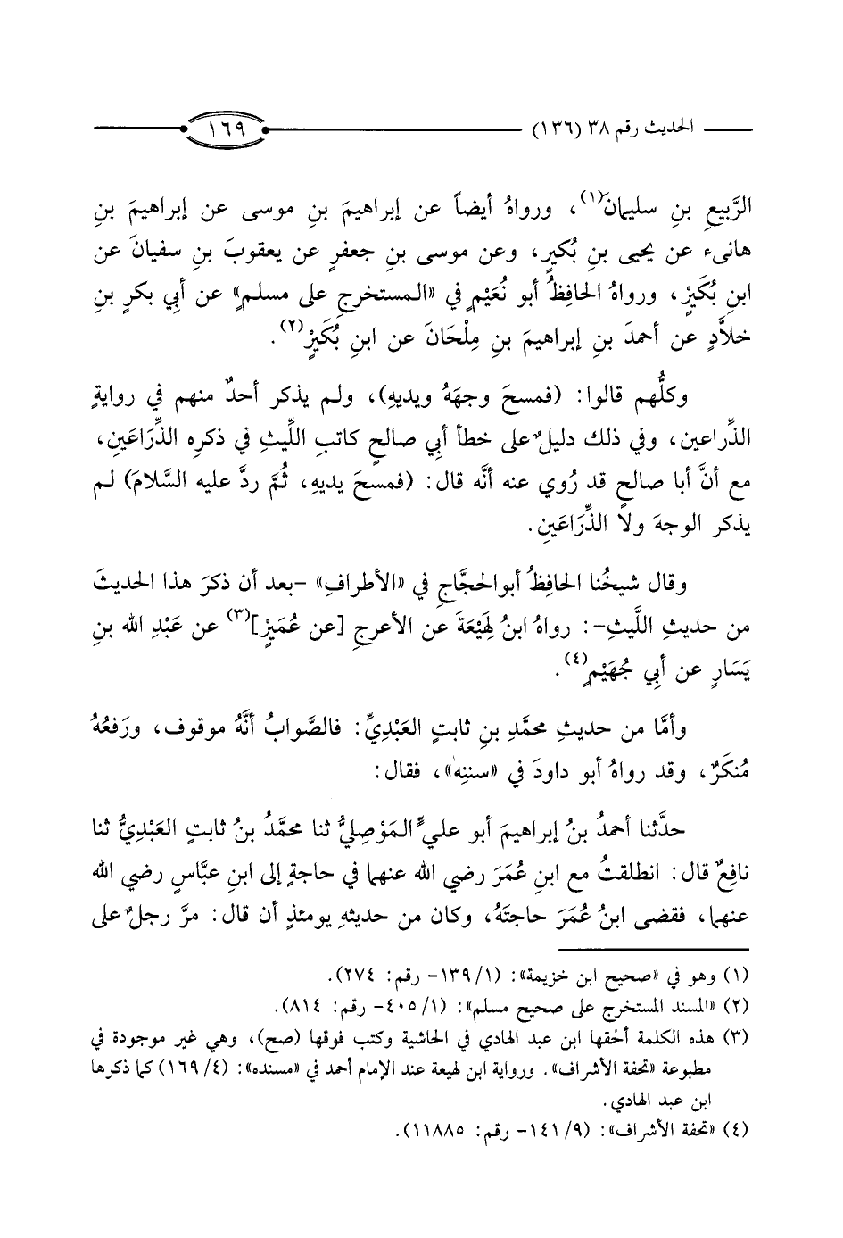 وَكُلُّهُمْ قَالُوا: (فَمَسَحَ وَجْهَهُ وَيَدَيْهِ) ، وَلَمْ يُذْكَرْ أَحَدٌ مِنْهُمْ فِي رِوَايَةِ الذِّرَاعَيْنِ، وَفِي ذَلِكَ دَلِيلٌ عَلَى خَطَأِ أَبِي صَالِحٍ كَاتِبِ اللَّيْثِ فِي ذِكْرِهِ الذِّرَاعَيْنِ، مَعَ أَنَّ أَبَا صَالِحٍ قَدْ رُوِيَ عَنْهُ أَنَّهُ قَالَ: (فَمَسَحَ يَدَيْهِ، ثُمَّ رَدَّ عَلَيْهِ السَّلامَ) لَمْ يَذْكُرِ الْوَجْهَ وَلا الذِّرَاعَيْنِ.