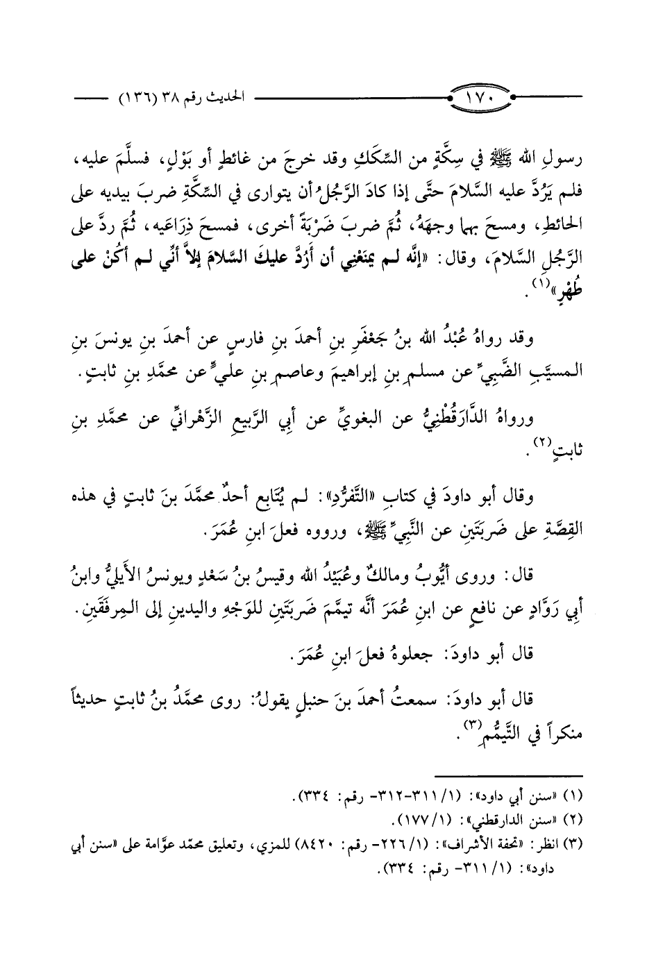 رَسُولِ اللَّهِ صَلَّى اللَّهُ عَلَيْهِ وَسَلَّمَ فِي سِكَّةٍ مِنَ السِّكَكِ وَقَدْ خَرَجَ مِنْ غَائِطٍ أَوْ بَوْلٍ، فَسَلَّمَ عَلَيْهِ، فَلَمْ يَرُدَّ عَلَيْهِ السَّلامَ حَتَّى إِذَا كَادَ الرَّجُلُ أَنْ يَتَوَارَى فِي السِّكَّةِ ضَرَبَ بِيَدَيْهِ عَلَى الْحَائِطِ، وَمَسَحَ بِهِمَا وَجْهَهُ، ثُمَّ ضَرَبَ ضَرْبَةً أُخْرَى فَمَسَحَ ذِرَاعَيْهِ، ثُمَّ رَدَّ عَلَى الرَّجُلِ السَّلامَ، وَقَالَ: إِنَّهُ لَمْ يَمْنَعْنِي أَنْ أَرُدَّ عَلَيْكَ السَّلامَ إِلا أَنِّي لَمْ أَكُنْ عَلَى طُهْرٍ «.