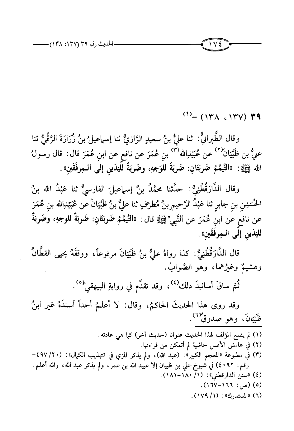 وَقَالَ الدَّارَقُطْنِيُّ: حَدَّثَنَا مُحَمَّدُ بْنُ إِسْمَاعِيلَ الْفَارِسِيُّ، ثَنَا عَبْدُ اللَّهِ بْنُ الْحُسَيْنِ بْنِ جَابِرٍ، ثَنَا عَبْدُ الرَّحِيمِ بْنُ مُطَرِّفٍ، ثَنَا عَلِيُّ بْنُ ظَبْيَانَ، عَنْ عُبَيْدِ اللَّهِ بْنِ عُمَرَ، عَنْ نَافِعٍ، عَنْ ابْنِ عُمَرَ، عَنِ النَّبِيِّ صَلَّى اللَّهُ عَلَيْهِ وَسَلَّمَ قَالَ: " التَّيَمُّمُ ضَرْبَتَانِ: ضَرْبَةٌ لِلْوَجْهِ، وَضَرْبَةٌ لِلْيَدَيْنِ إِلَى الْمِرْفَقَيْنِ ".